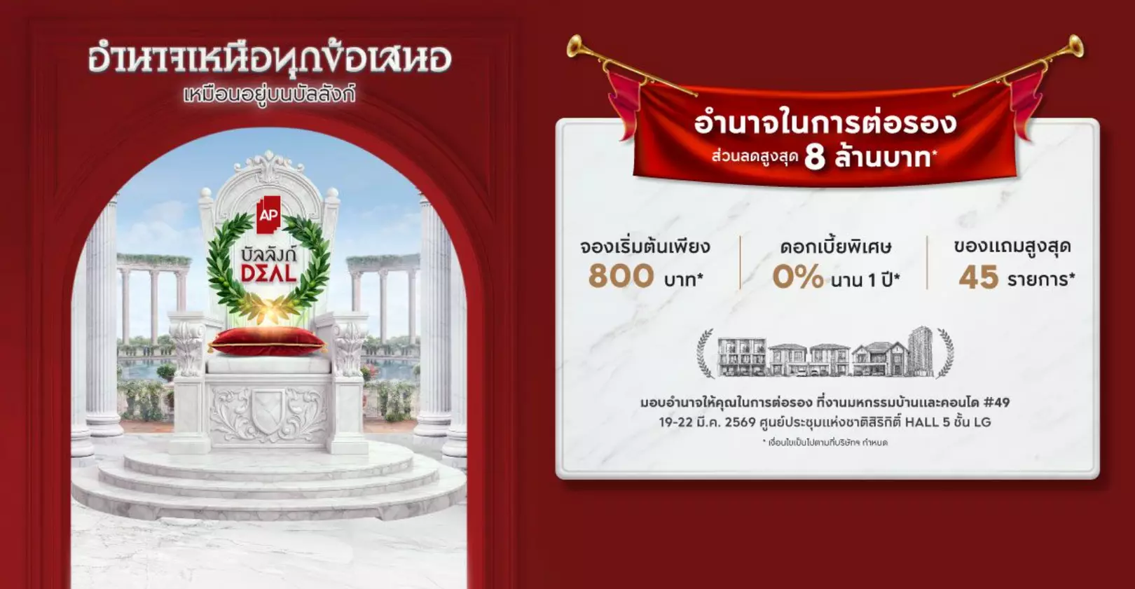 AP Thailand จัดหนักแคมเปญ “บัลลังก์ DEAL” ในงานมหกรรมบ้านและคอนโด ครั้งที่ 49 วันที่ 19-22 มีนาคม 2569 ณ ศูนย์ฯ สิริกิติ์ ขน 180 โครงการ ทั้งบ้านเดี่ยว ทาวน์โฮม และคอนโดมิเนียม ชูส่วนลดสูงสุด 10 ล้านบาท* จองเพียง 3,999 บาท* ดอกเบี้ยพิเศษ 0% นาน 1 ปี*
