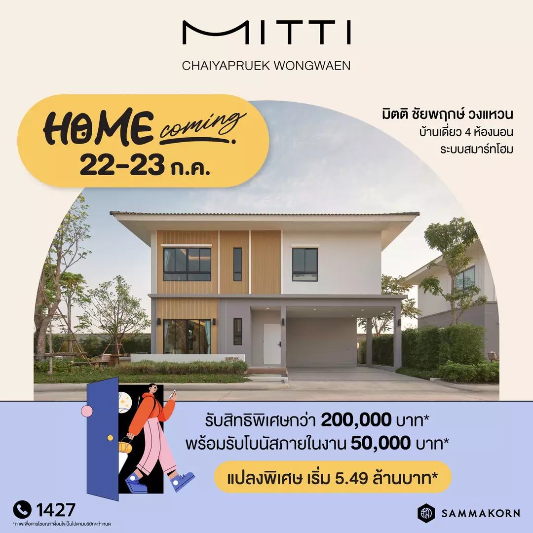 สนใจร่วมงาน Home Coming: The New Home Journey (อ้าแขนรับการเดินทางสู่บ้านหลังใหม่) พร้อมจับจองเป็นเจ้าของบ้าน ณ สำนักงานขาย โครงการมิตติ ชัยพฤกษ์ วงแหวน ในวันเสาร์ที่ 22 – วันอาทิตย์ที่ 23 กรกฎาคม 2566 ที่สำคัญงานนี้ลูกบ้าน “สัมมากร” โซนราชพฤกษ์, ชัยพฤกษ์ ก็สามารถตบเท้าร่วมแจมความสนุกพร้อมทั้งรับสิทธิพิเศษเหนือใครได้