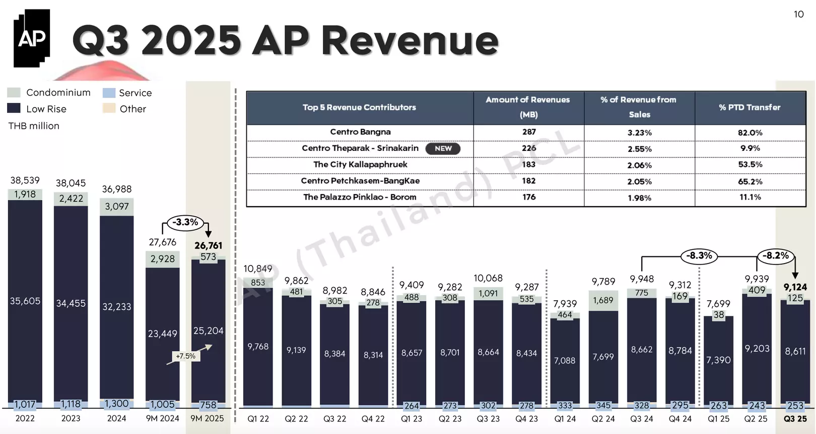 ไตรมาส 3/2568 เอพี (ไทยแลนด์) มีรายได้รวม 9,124 ล้านบาท ลดลง 8.3% จากปีก่อน และมีกำไรสุทธิ 1,155 ล้านบาท ลดลง 20.4% รายได้หลักมาจากการขาย 8,871 ล้านบาท และรายได้บริการ 253 ล้านบาท