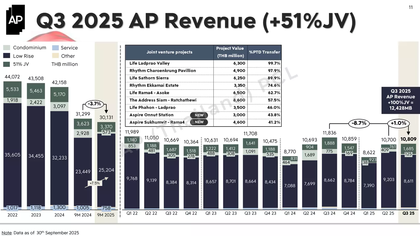 ด้านอื่นๆ ส่วนแบ่งกำไรจากบริษัทร่วม/ร่วมค้าเพิ่มขึ้นเป็น 730.39 ล้านบาท (+164%) จากโครงการในออสเตรเลียที่เริ่มโอนมากขึ้น ค่าใช้จ่ายขายและบริหารอยู่ที่ 2,825.65 ล้านบาท ลดลง 9% แต่สัดส่วนต่อรายได้รวมเพิ่มเป็น 16.3% (จาก 13.6%) เพราะรายได้หดตัว ทั้งนี้ ณ 30 ก.ย. 2568 มียอดขายรอรับรู้รายได้ (Backlog) 14,205 ล้านบาท คาดรับรู้ได้ 5,332 ล้านบาทในไตรมาส 4/2568 และที่เหลือ 8,873 ล้านบาททยอยรับรู้ใน 3 ปีถัดไป