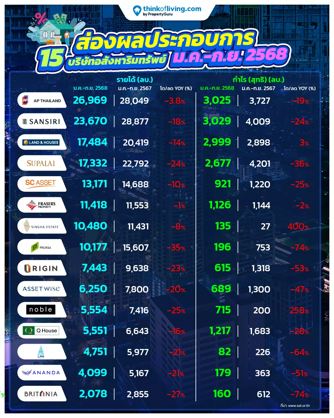 รายได้และกําไรรอบ 9 เดือนในปี 2568 ของ 15 บริษัทอสังหาริมทรัพย์ไทย ที่จดทะเบียนในตลาดหลักทรัพย์ ลดลง 16% และ 25% ตามลําดับ