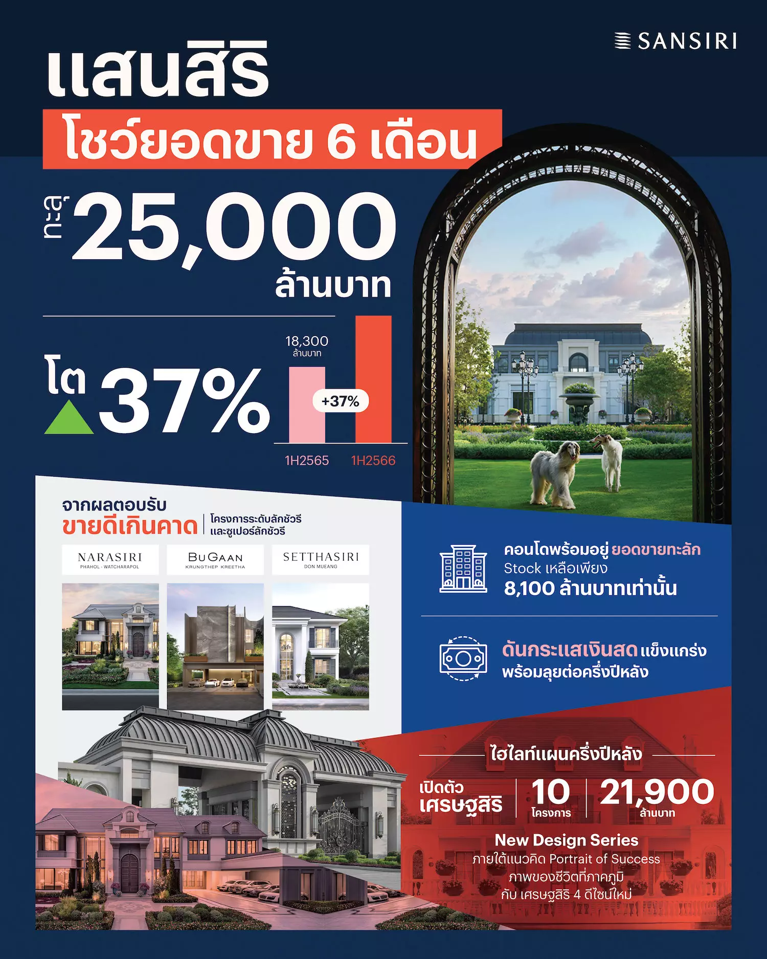 แสนสิริเผยผลงานครึ่งแรกปี 66 แข็งแกร่งด้วย ยอดขาย 25,000 ล้านบาท โต 37% จากช่วงเดียวกันของปีก่อน ที่มียอดขาย 18,300 ล้านบาท ปลื้มโครงการระดับลักซ์ชัวรี เปิดตัวใหม่ทั้ง 3 แบรนด์ ได้รับการตอบรับสูง ทั้งนาราสิริ พหล-วัชรพล บูก้าน กรุงเทพกรีฑา และเศรษฐสิริ ดอนเมือง พร้อมเปิดตัวเศรษฐสิริ 10 โครงการใหม่ปีนี้ มูลค่ารวม 21,900 ล้านบาท