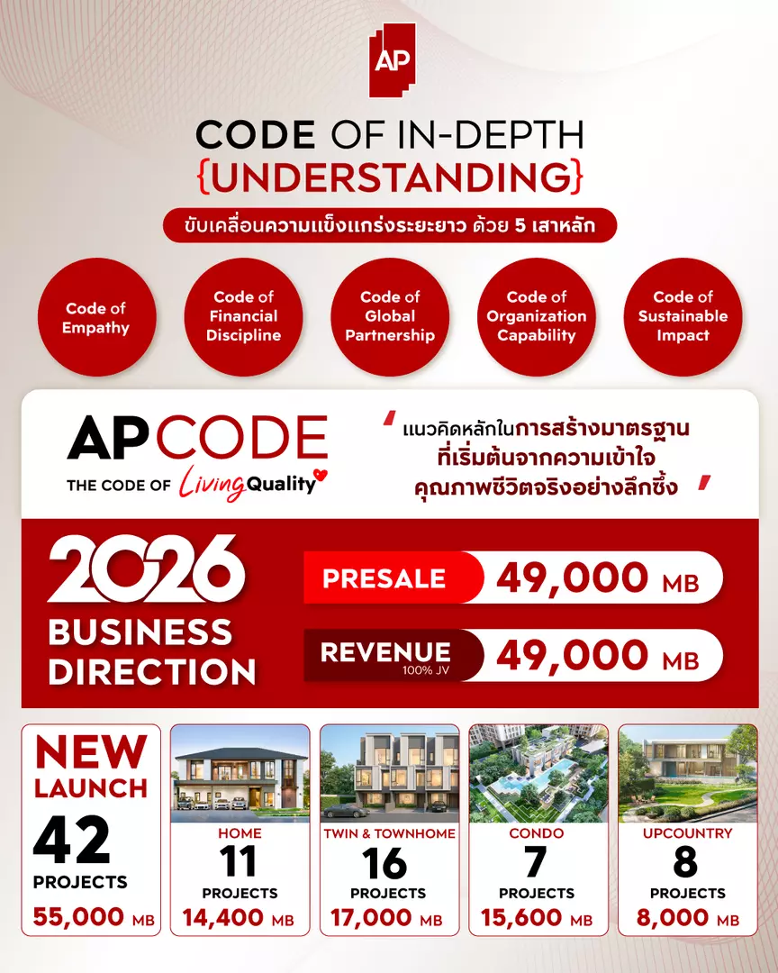ท่ามกลางความท้าทายของเศรษฐกิจปี 2569 บมจ. เอพี ไทยแลนด์ ผู้นำอุตสาหกรรมอสังหาฯ ไทย ประกาศเดินหน้าเต็มสูบด้วยเป้ายอดขายและรายได้ที่ 49,000 ล้านบาท พร้อมเปิดตัวยุทธศาสตร์ใหม่ “CODE OF IN-DEPTH UNDERSTANDING”