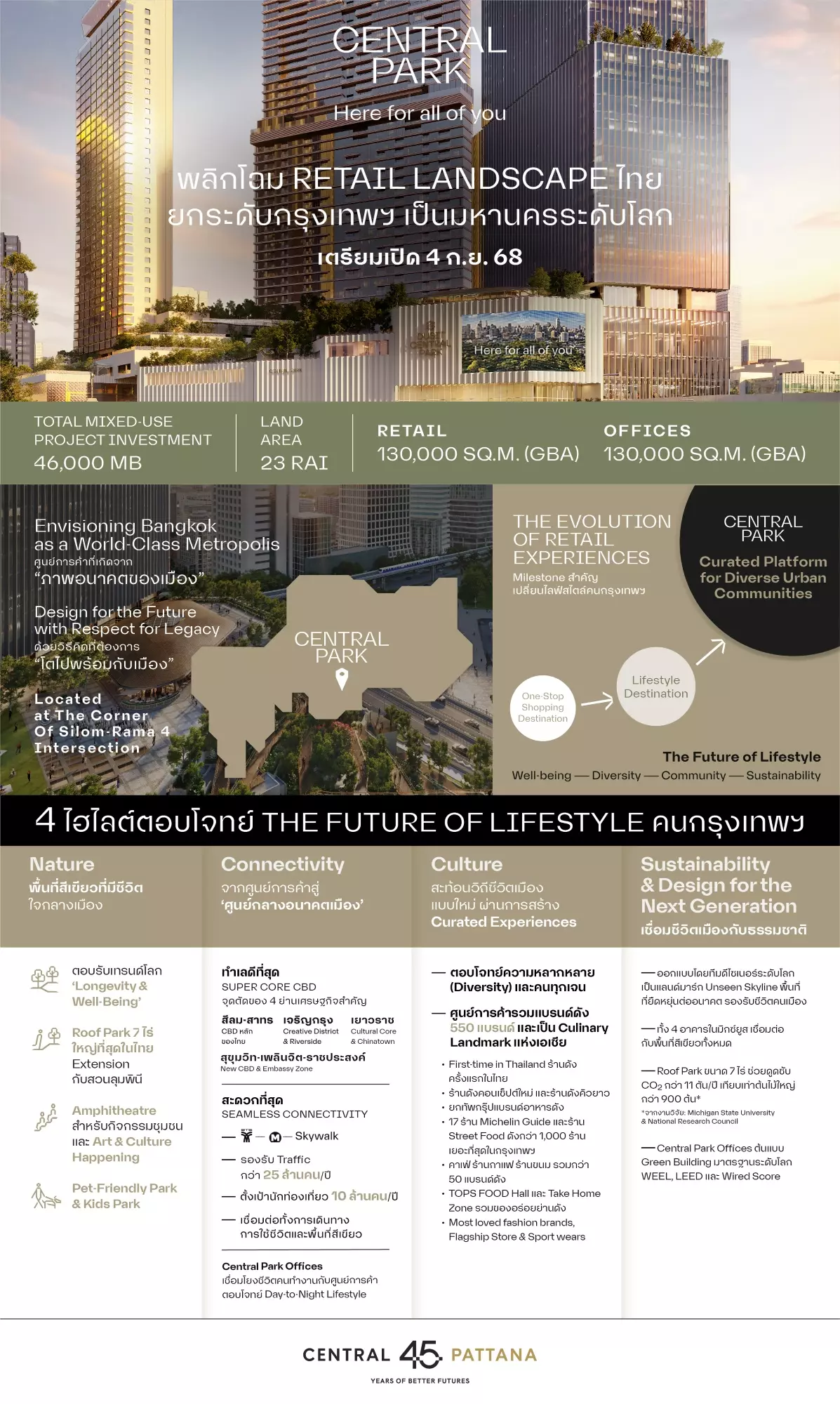 แนวคิดการออกแบบผสานชีวิตเมืองกับธรรมชาติอย่างกลมกลืนนี้ สะท้อน The Future of Lifestyle ที่ครบมิติ สมดุลและยั่งยืน โดยมี People of Central Park เป็นแรงบันดาลใจ ทำให้เราสร้างพื้นที่ที่เชื่อมต่อชีวิตทุกช่วงเวลา ตั้งแต่เช้าวิ่งที่สวนลุม แวะจิบกาแฟบน Roof Park พักกลางวันกับ Michelin Guide ช่วงบ่ายที่ Take Home Zone และปิดท้ายด้วย Rooftop Bar กับเพื่อน ทั้งหมดนี้คือวิสัยทัศน์ในการสร้างศูนย์การค้าที่เติบโตไปพร้อมกับเมือง และเป็นต้นแบบของชีวิตเมืองในอนาคต”
