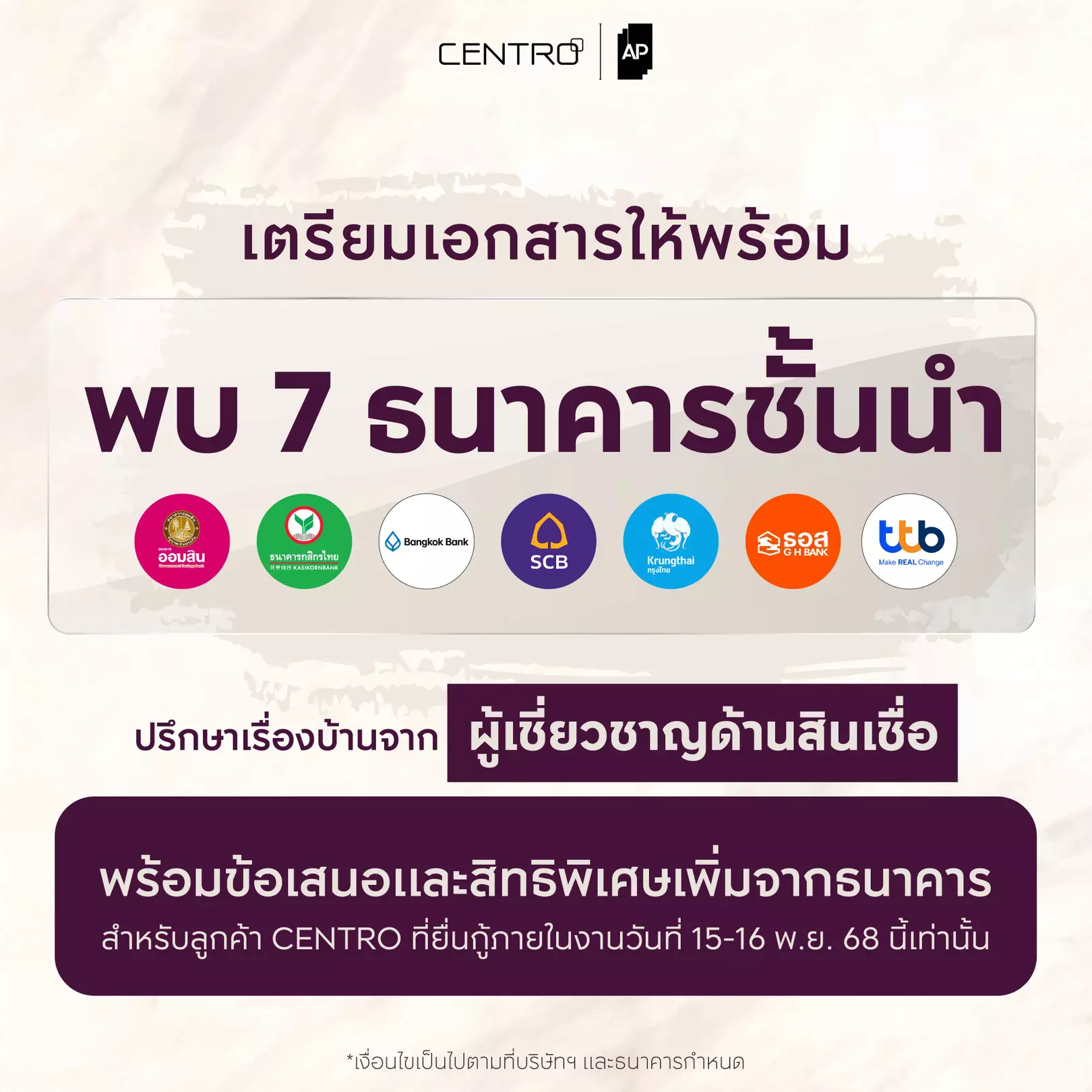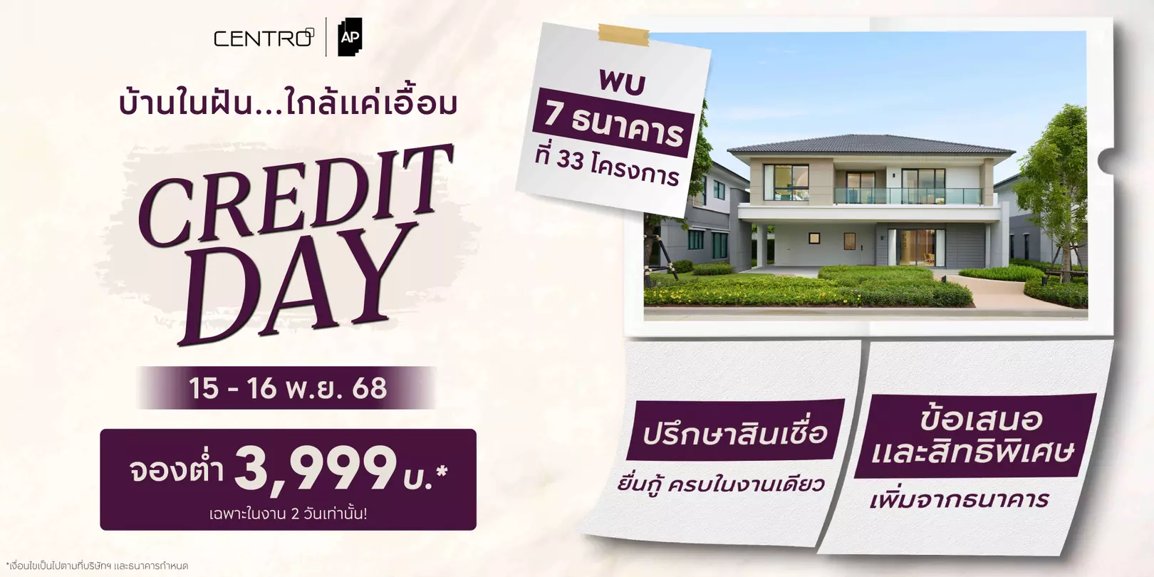 #CreditDay 15 – 16 พ.ย. นี้ บ้านในฝัน.. ใกล้แค่เอื้อม พบ 7 ธนาคารชั้นนำ ปรึกษาสินเชื่อพร้อมข้อเสนอพิเศษ ที่บ้านเดี่ยวAP #CENTRO 33 โครงการ ปรึกษาเรื่องบ้าน จากผู้เชี่ยวชาญด้านสินเชื่อ พร้อมเงื่อนไขสุดพิเศษและโปรโมชั่นเพิ่มเติมจากธนาคาร