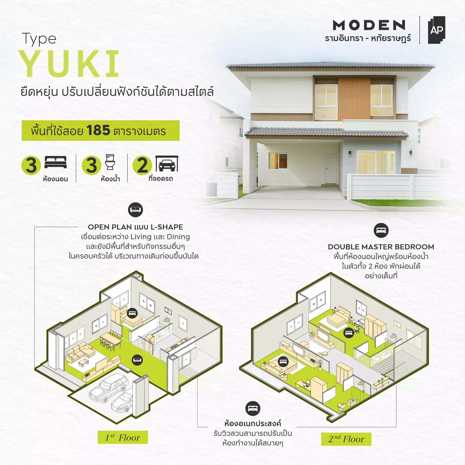 พื้นที่ใช้สอย 185 ตร.ม. 3 ห้องนอน 3 ห้องน้ำ 2 ที่จอด