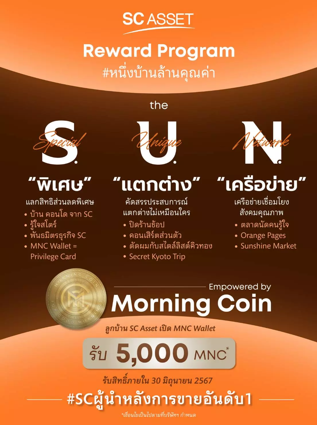 นายณัฐพงศ์ คุณากรวงศ์ ประธานเจ้าหน้าที่บริหาร บริษัท เอสซี แอสเสท คอร์ปอเรชั่น จำกัด (มหาชน) หรือ SC ผู้นำอสังหาริมทรัพย์คุณภาพและมีนวัตกรรม กล่าวว่า “SC มุ่งสร้างคุณค่าและคุณภาพชีวิตที่ดีให้ลูกบ้าน ด้วยนวัตกรรมที่ทันสมัยตามแนวคิด #หนึ่งบ้านล้านคุณค่า ที่เชื่อว่าการลงทุนที่อยู่อาศัยนอกจากจะได้บ้านและคอนโดแล้ว ยังควรได้คุณภาพชีวิตที่ดีจากการได้สิทธิประโยชน์ต่างๆ อีกด้วย จึงเป็นที่มาของการเปิดตัว “มอร์นิง คอยน์” (Morning Coin – MNC) ที่มีการนำเทคโนโลยีบล็อกเชนที่จะเชื่อมโยงลูกบ้านสู่โลกแห่งสิทธิพิเศษมากมาย ภายใต้ SC Asset Reward Program “The S.U.N.” ประกอบด้วย
