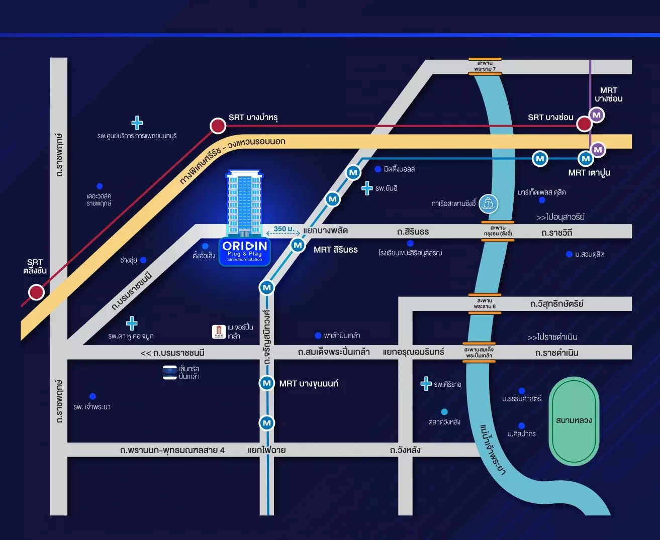 แผนที่จากโครงการแสดงตำแหน่งของ Origin Plug & Play Sirindhorn Station (ออริจิ้น ปลั๊ก & เพลย์ สิรินธร สเตชั่น) ที่ตั้งอยู่ติดถนนใหญ่สิรินธร เหมาะกับคนที่กำลังมองหาคอนโด High Rise พร้อมอยู่ในโซนปิ่นเกล้า – สิรินธร ทำเลของโครงการอยู่ห่างจากแยกบางพลัดและทางขึ้น – ลงสถานี MRT สิรินธรประมาณ 350 เมตร ถือว่าใกล้แนวรถไฟฟ้าในระยะเดินได้ หรือใครที่ใช้รถส่วนตัวในการเดินทาง จากถนนสิรินธรสามารถขับไปเชื่อมต่อกับถนนบรมราชชนนี , ถนนจรัญสนิทวงศ์ , ถนนราชพฤกษ์ , ถนนสมเด็จพระปิ่นเกล้า , ถนนพรานนก – พุทธมณฑลสาย 4 และถนนราชวิถีได้ง่าย ทั้งยังใกล้ทางพิเศษศรีรัช วงแหวนรอบนอก เดินทางเข้า – ออกเมืองได้สะดวก โดยจุดเด่นของโครงการอยู่ที่ทำเลติดถนนใหญ่ ใกล้รถไฟฟ้า และห้างเซ็นทรัล ปิ่นเกล้าแค่ประมาณ 3.4 กิโลเมตร