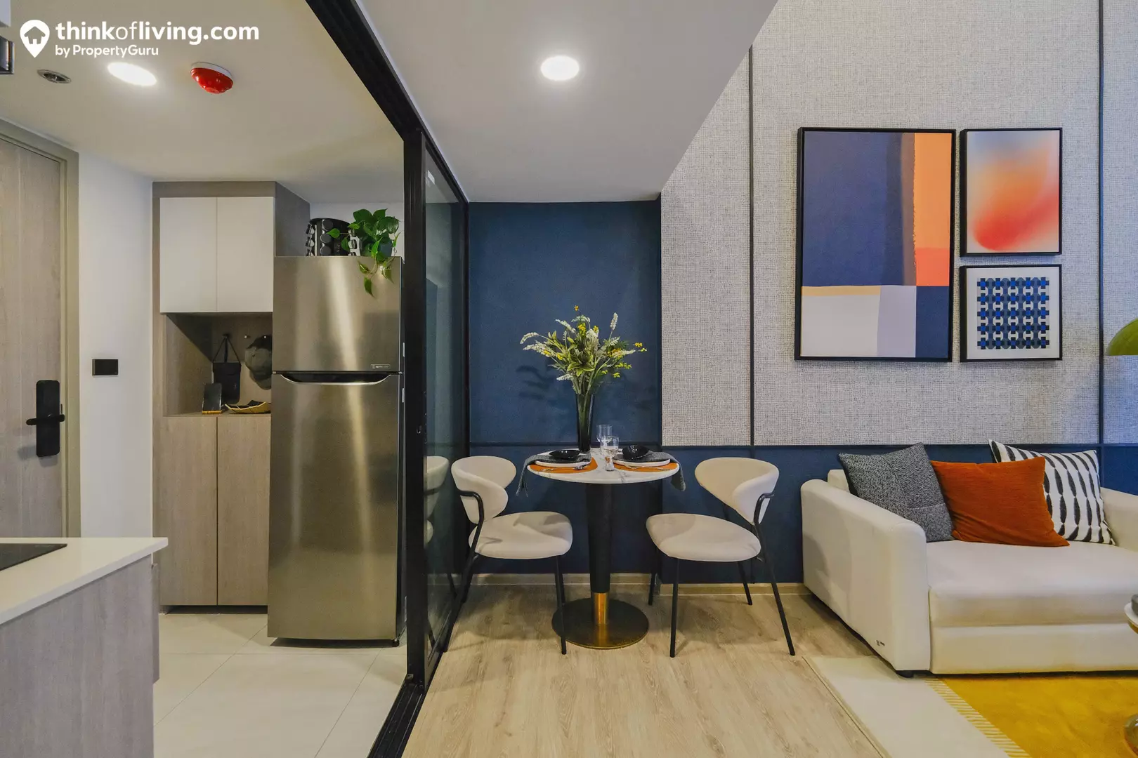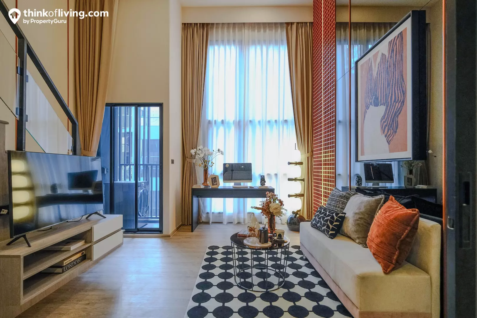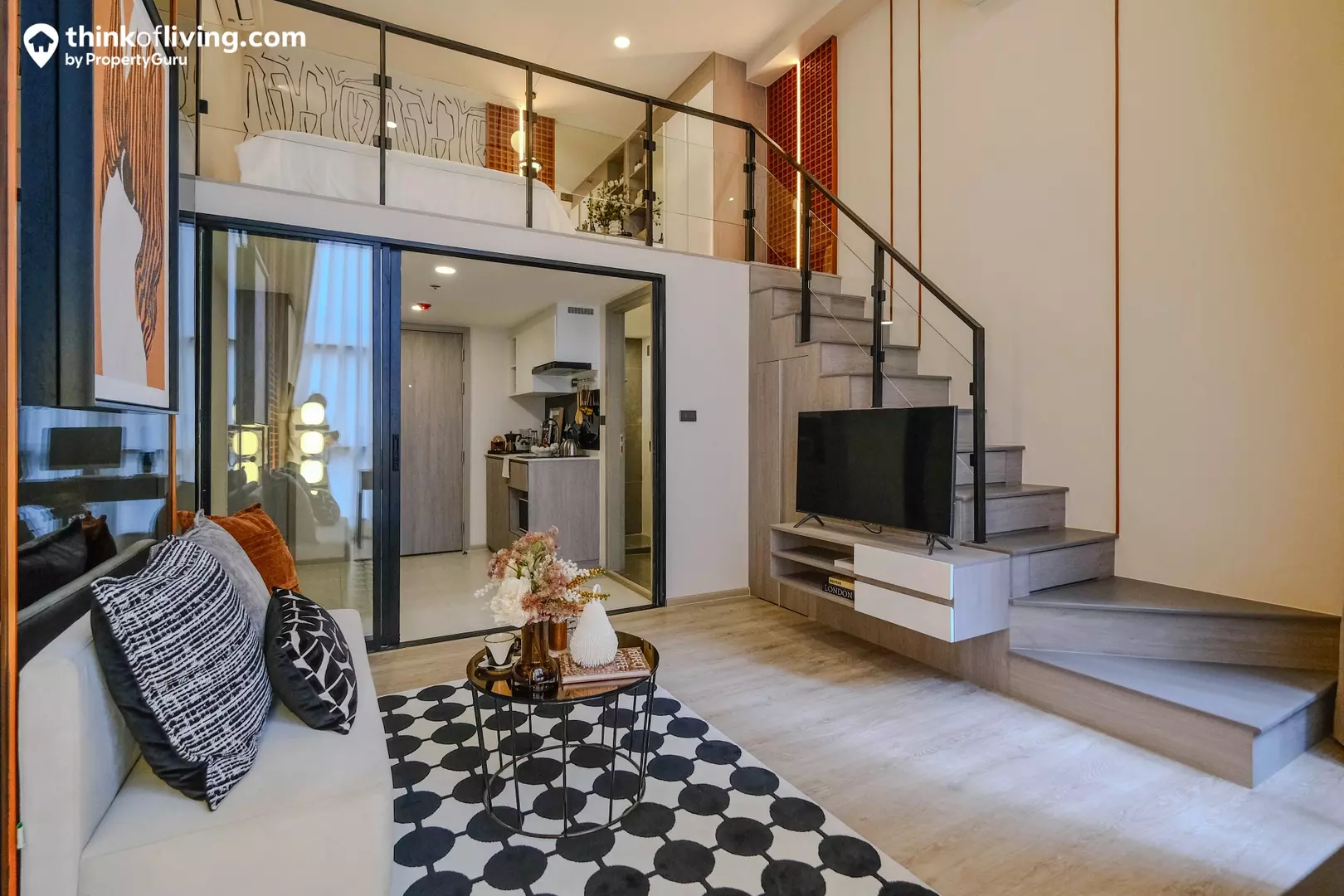 ห้องแรกที่เราจะพามาชมคือ ห้องตัวอย่าง 1 Bedroom High Ceiling 25 ตร.ม. เป็นห้องเพดานสูงขนาดเริ่มต้นของโครงการ ราคาเริ่ม 3.29 ล้านบาท* เหมาะกับคนที่ชอบห้องแบบ 2 ชั้น พื้นที่ภายในแยกเป็นสัดส่วน ได้อารมณ์เหมือนอยู่บ้าน เมื่อเทียบกับห้องแบบ Simplex ที่ได้พื้นที่ใช้สอยเท่ากัน จะได้บรรยากาศที่โปร่งโล่งกว่า และมีชั้นลอยแยกเป็นห้องนอนให้ขึ้นไปใช้งานได้ โดยห้องเพดานสูง 1 Bedroom ยังมีให้เลือก 2 Layout แตกต่างกันที่ขนาดครัวปิดด้านหน้า ในห้องแรกจะได้ครัวหน้าแคบ เหมาะกับคนที่ไม่ได้เน้นทำอาหารจริงจังมาก ไม่ใช้พื้นที่ทำครัวเยอะ ได้ Common Area ด้านในขนาดใหญ่ ในแปลนวางเป็นโต๊ะทำงาน 3 – 4 ที่นั่งได้เลย