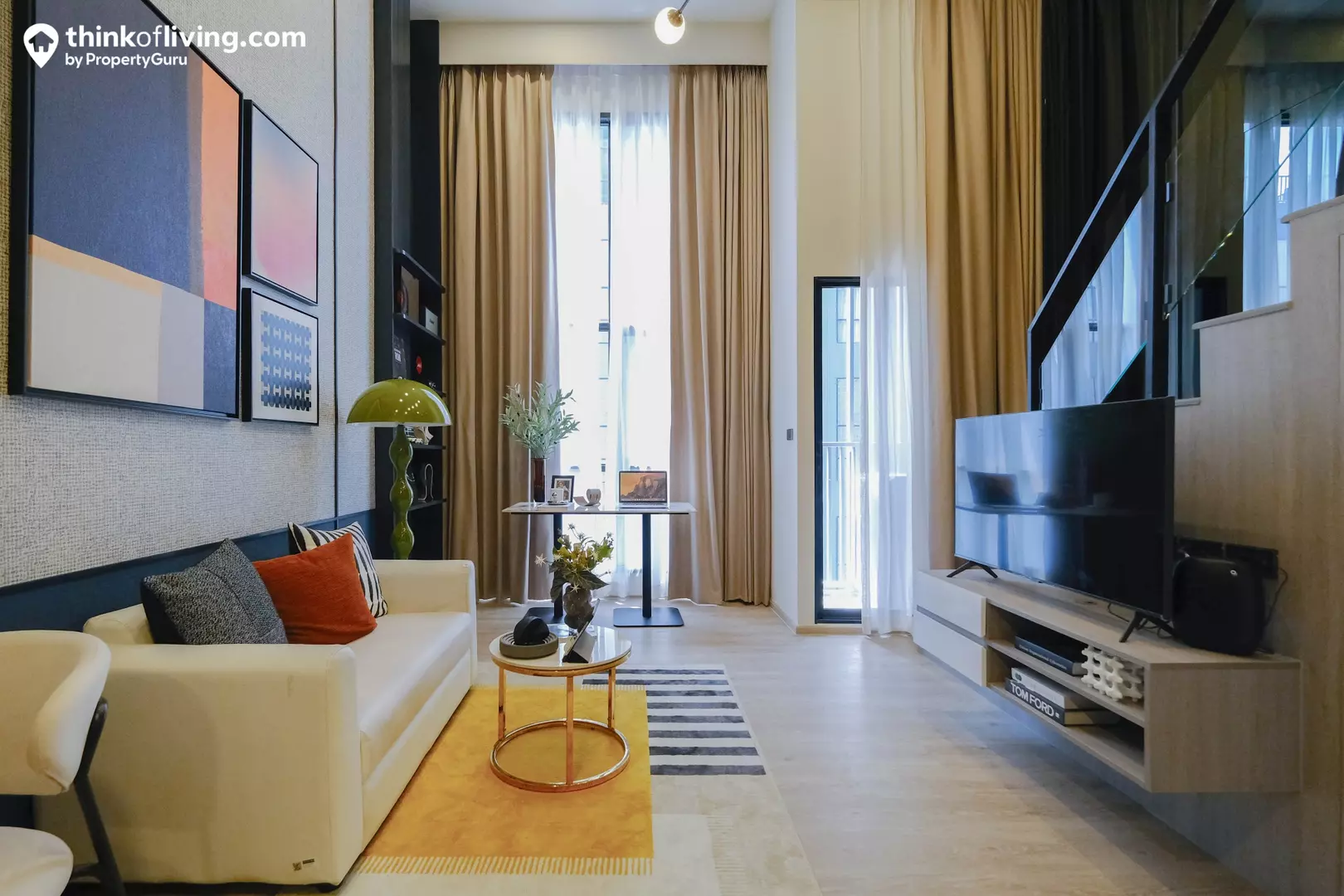 พื้นที่ใช้งานส่วนนั่งเล่นในห้องตัวอย่าง 1 Bedroom High Ceiling
