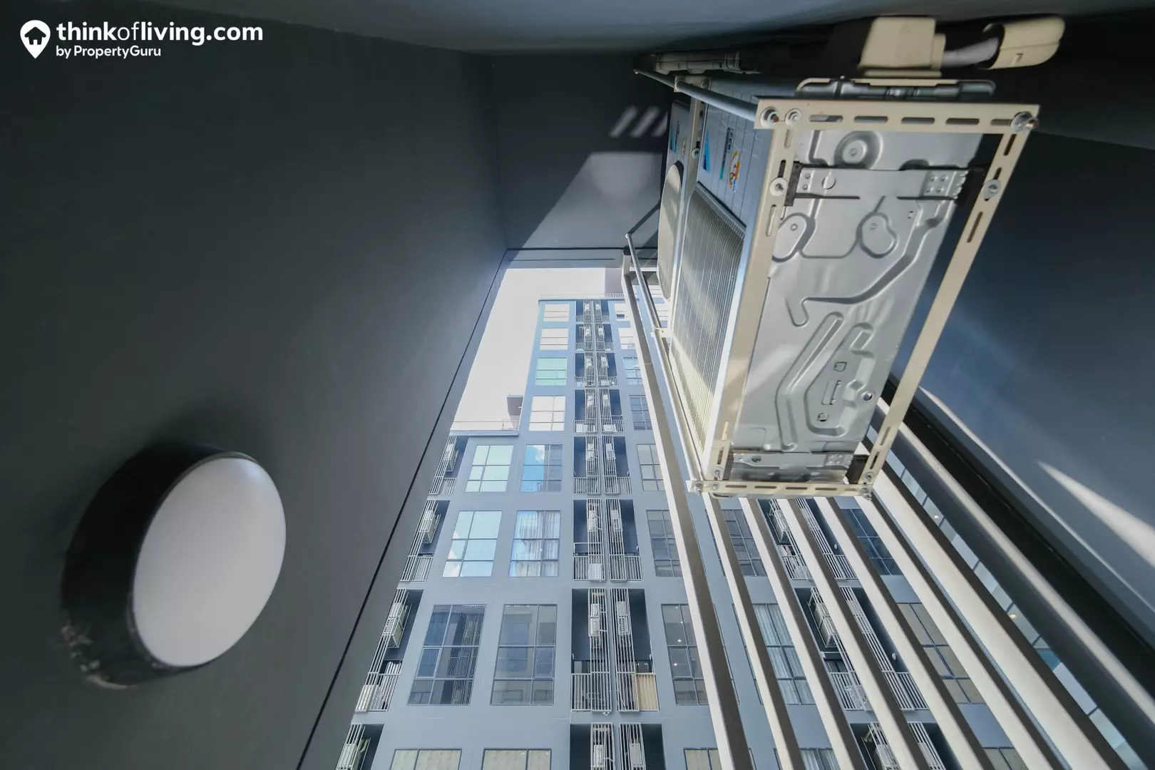 ระเบียงด้านนอกได้ความกว้าง 0.83×1.30 เมตร คอมเพรสเซอร์แอร์ถูกยกไปแขวนไว้ด้านบนทำให้สามารถใช้พื้นที่ด้านล่างวางเครื่องซักผ้าได้ ราวกันตกเป็นซี่เหล็กโปร่ง ให้ความรู้สึกโปร่งโล่ง ระบายอากาศได้