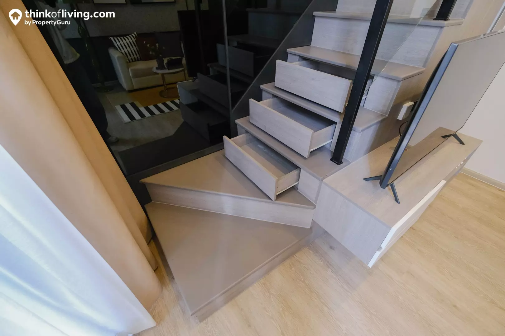 บันไดเป็นโครงสร้างเหล็กกว้างประมาณ 70 เซนติเมตร ลูกนอนกว้าง 26 เซนติเมตร ลูกตั้งสูง 20 เซนติเมตร ใช้งานขึ้น – ลงได้สะดวก นอกจากมีตู้เก็บของด้านข้างแล้ว ขั้นบันไดยังสามารถดึงออกมาเป็นลิ้นชักได้ด้วย