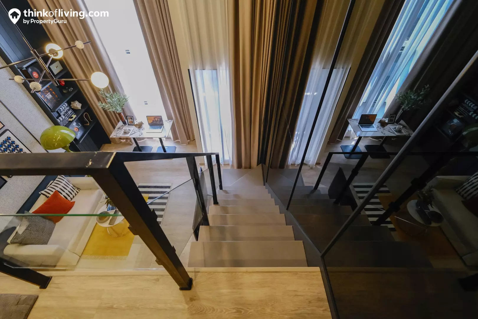 ชั้นบนเป็นพื้นที่ห้องนอน วางเฟอร์นิเจอร์ Built – in จากโครงการได้ครบ ปลายเตียงเป็นราวกันตกกระจก มีหน้าต่าง Full Height ช่วยเปิดรับแสงและวิว เพิ่มความโปร่งโล่ง