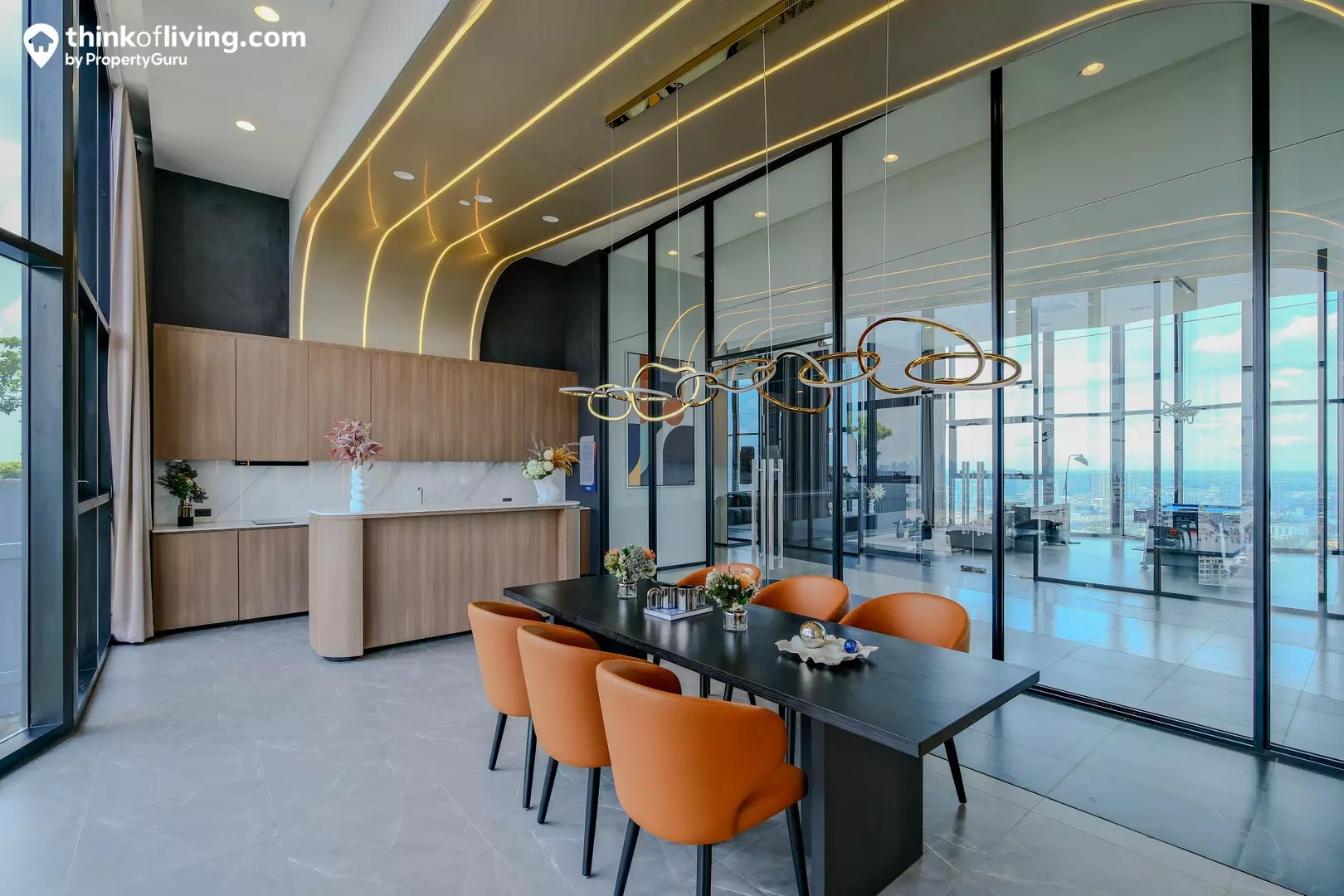 ด้านในมีทั้ง Co – Dining Space และ Game Room ลูกบ้านสามารถขึ้นมาพักผ่อน สังสรรค์ร่วมกันเป็นกลุ่มได้ มีโซน Pantry ไว้เตรียมอาหารพร้อมโต๊ะยาว รองรับได้ 6 – 8 ที่นั่ง โต๊ะพลูและมุมเล่นเกมส์ ดูหนังให้เลือกใช้งานได้