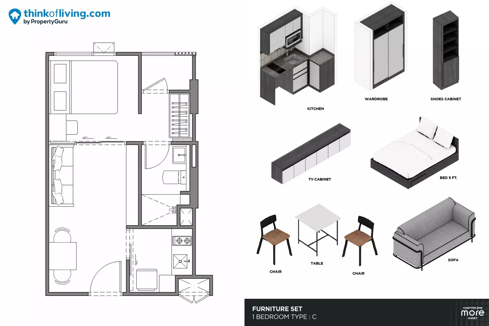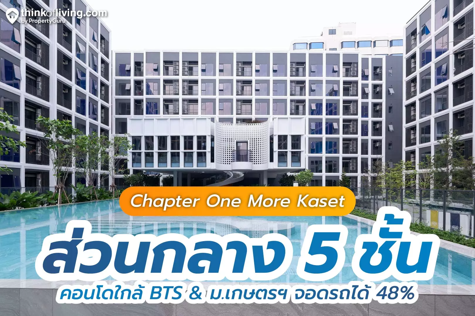 สำหรับโครงการ Chapter One More Kaset เป็นคอนโด Low Rise ที่ห่างจากมหาวิทยาลัยเกษตรศาสตร์เพียง 600 เมตร และห่างจาก BTS เพียง 720 เมตร เมื่อเทียบกับคอนโด Low Rise บนทำเลเดียวกันจะอยู่ลึกเข้าไปในซอย ต้องเรียกวินมอเตอร์ไซค์ในการไปไหนมาไหนบนย่าน นอกจากนั้นโครงการนี้ยังมีพื้นที่ส่วนกลางมากถึง 5 ชั้น เน้นพื้นที่ Co-Working Space หลายจุดและพื้นที่จอดรถรวม 48% ถือว่าให้มาเยอะลำดับต้นๆในย่านเลยค่ะ โดยมีราคาเริ่มต้นปัจจุบันอยู่ที่ 2.79 ล้านบาทกับห้อง 1 Bedroom ขนาด 28 ตร.ม. ที่ตกแต่งห้องมาให้ครบพร้อมเข้าอยู่