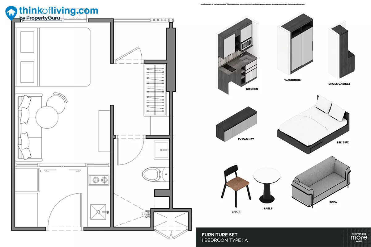 1 Bedroom (Type A) พื้นที่ใช้สอย 22.50 ตร.ม.