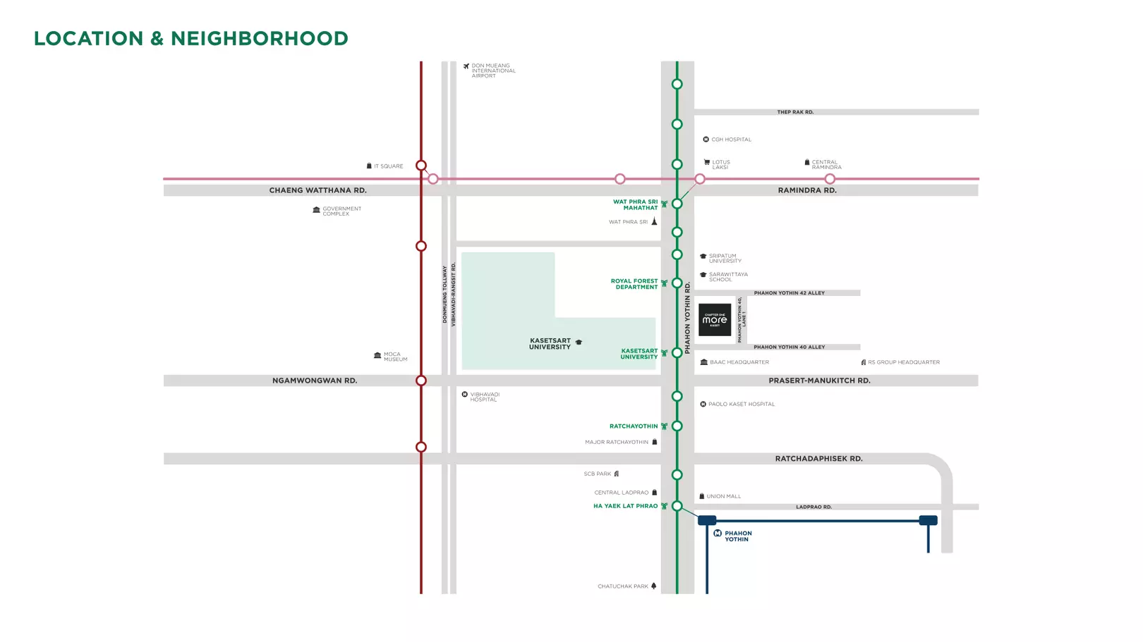 แต่หากอยากไปห้างใหญ่ๆก็จะมี Major Cineplex รัชโยธิน, The Mall Lifestore งามวงศ์วาน, Union Mall, Lotus’s ลาดพร้าว และ Central ลาดพร้าว ให้เรามาเดินเล่นช้อปปิ้งกันได้ง่ายๆ นอกจากนั้นหาก Central พหลโยธิน ที่ตั้งอยู่บนที่ดินกว่า 49 ไร่ คาดเปิด Q4/2569 ทำให้เมื่อเปิดบริการแล้ว ก็จะช่วยเพิ่มความคึกคักบนทำเลมากยิ่งขึ้น ส่วนโรงพยาบาลและสำนักงานขนาดใหญ่ก็มีหลายแห่งด้วยค่ะ เช่น โรงพยาบาลเปาโล เกษตร , โรงพยาบาลวิภาวดี , ปตท. สำนักงานใหญ่ , SCB Park , การไฟฟ้าส่วนภูมิภาค สำนักงานใหญ่ เป็นต้น