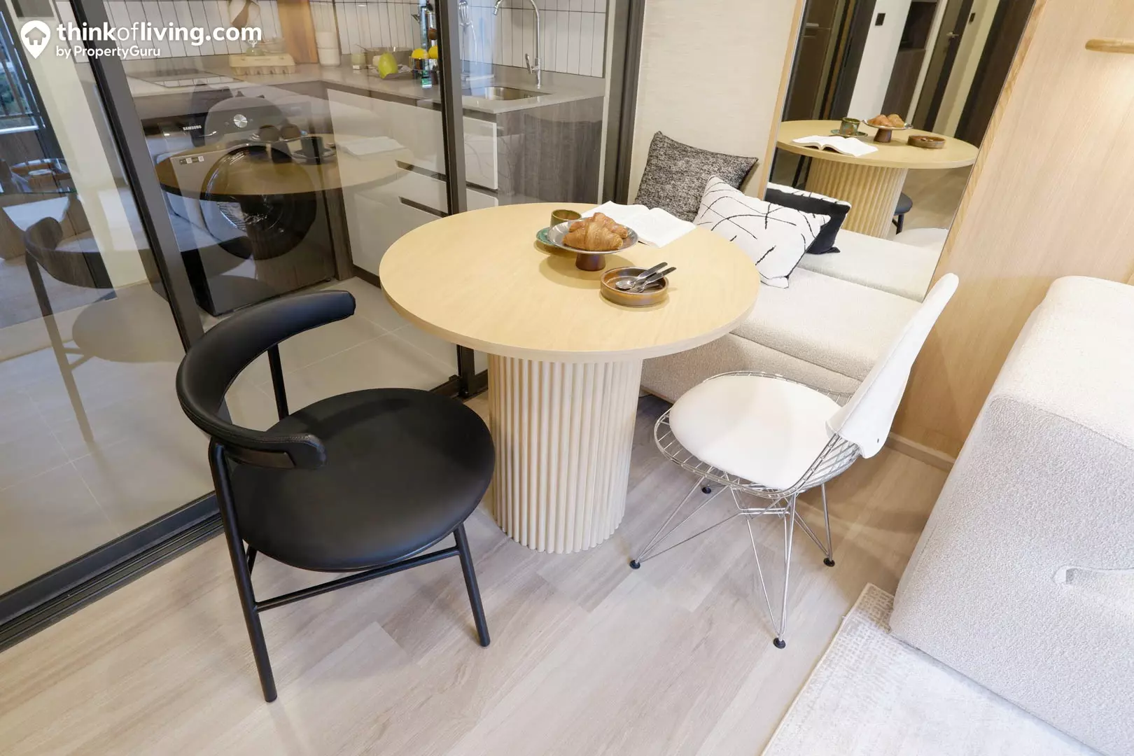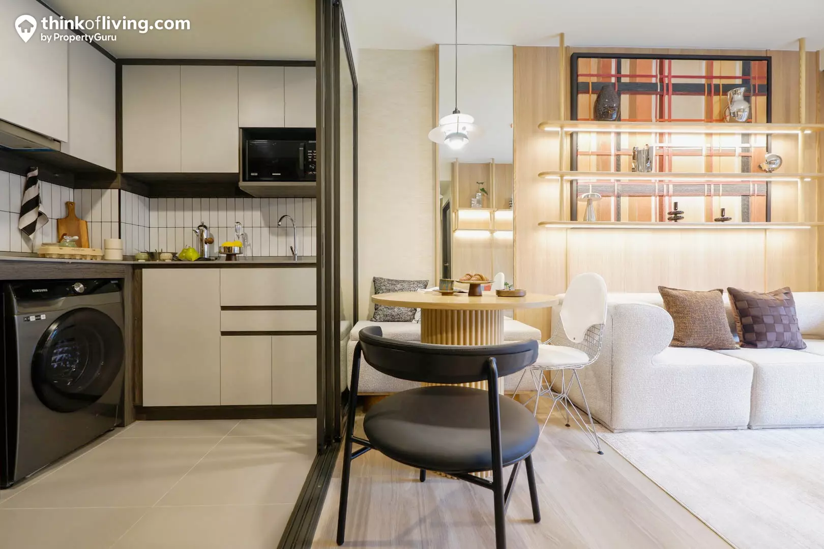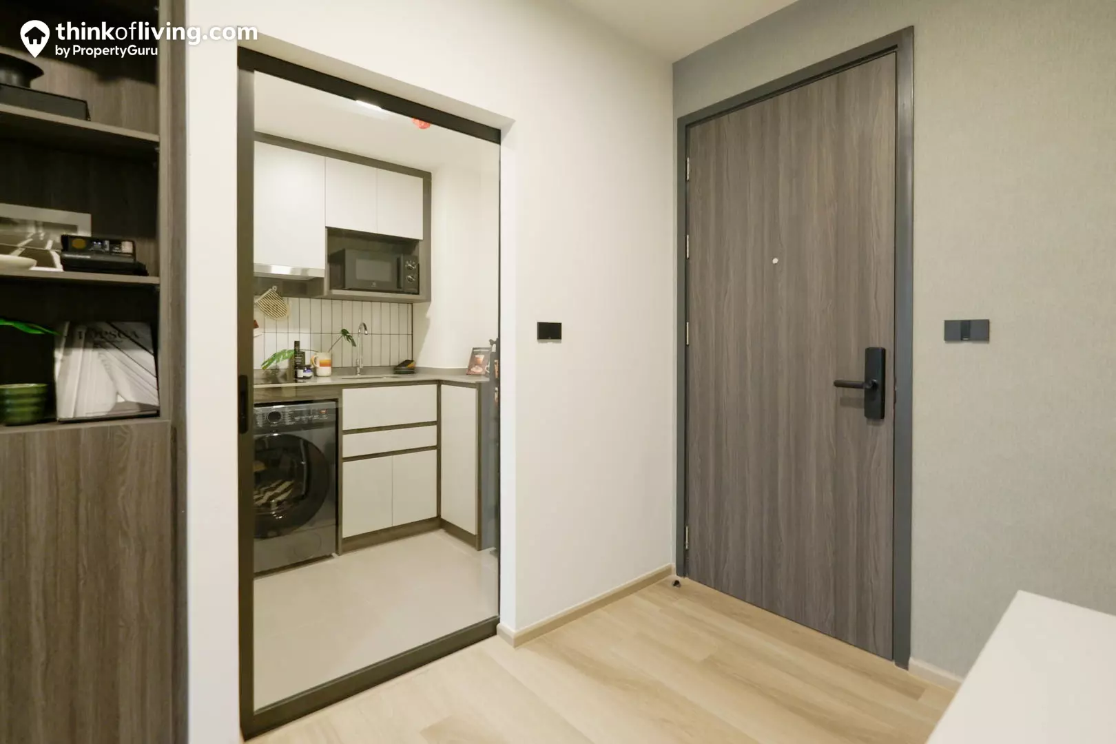อีกด้านหนึ่งของห้องจะเป็นครัว โดยจะเป็นพื้นที่เชื่อมต่อกับ Living Area แบบนี้เลย ซึ่งเป็นการออกแบบเพื่อให้มีความกว้างขวางและโปร่งโล่ง แต่ถ้าใครที่ชอบทำอาหารจริงจัง ก็สามารถติดประตูเพิ่มเติมได้ด้วยตัวเอง กลิ่น/ควันจะได้ไม่เข้ามารบกวนพื้นที่ในห้อง