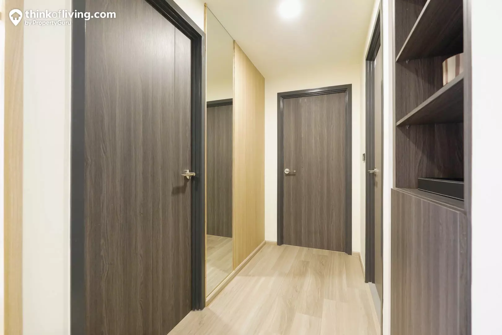 เข้ามาภายในห้องเราจะเจอกับ Common Area ซึ่งจากมุมนี้เราจะยังมองไม่เห็นส่วนห้องนอน ครัว และห้องน้ำทั้งหมด จึงทำให้มีความเป็นส่วนตัวภายในห้องเพิ่มขึ้น