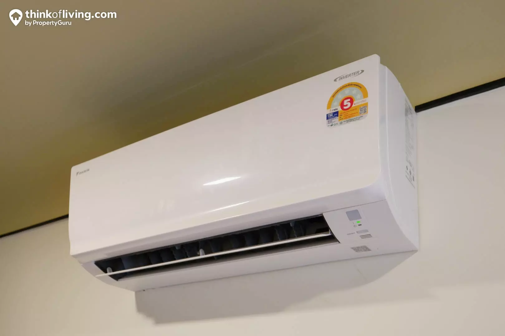 ด้านซ้ายมือจะเป็นระเบียงที่มีขนาด 1 x 1.4 m. สามารถออกมาใช้งานตากผ้าได้เต็มที่ ซึ่ง Condensing Unit จะแขวนอยู่ด้านบน และเป่าลมร้อนมาด้านข้าง เวลาตากผ้าคือจะแห้งไวดีมากๆ แต่ถ้าใครชอบออกมาใช้งานระเบียงบ่อยๆ ก็อาจติดกริลดันลมร้อนออกไปด้านนอกได้นะคะ