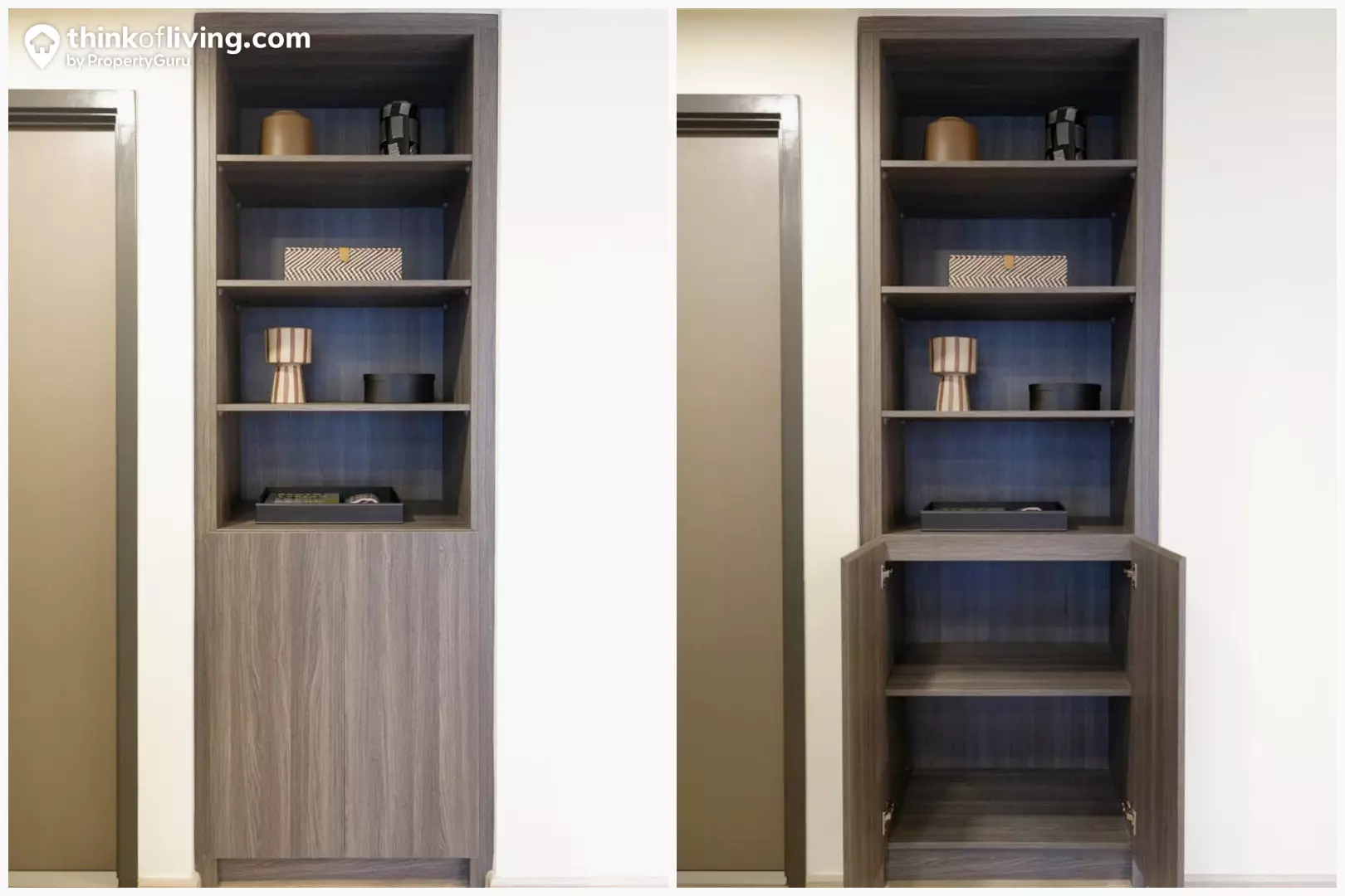 โดยพื้นที่ส่วนแรกจะเป็น Living Area ระยะดูทีวีกว้าง 2.6 m. สามารถใช้ทีวี 40 – 50 นิ้วได้ และเราก็สามารถ Built-in เพิ่มพื้นที่เก็บของได้เหมือนกับห้อง 1 Bedroom ก่อนหน้านี้ได้เลย