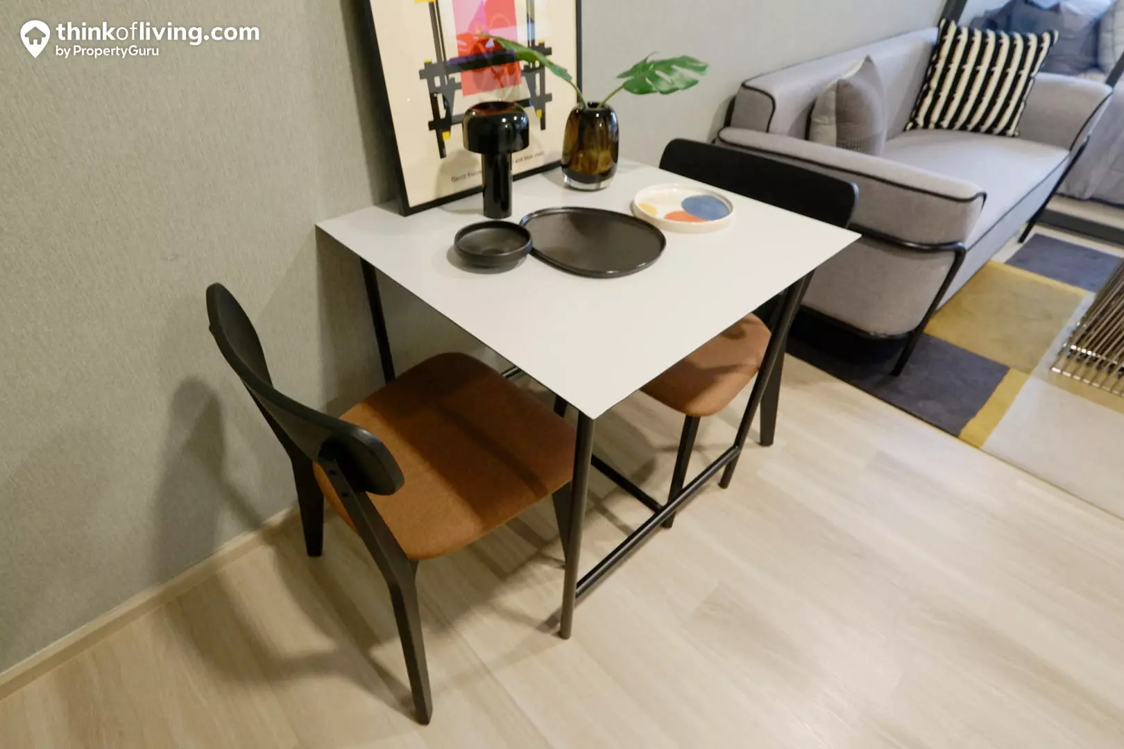 ถัดเข้ามาตรงกลางห้องจะเป็นพื้นที่วางโต๊ะทานอาหาร ซึ่งจะมีขนาดค่อนข้างใหญ่เลย หรือใครจะปรับเป็นมุมนั่งทำงานอ่านหนังสือ และขยายโซฟาให้กลายเป็นตัวใหญ่นั่ง/นอนสบายกว่านี้ก็ได้เลย