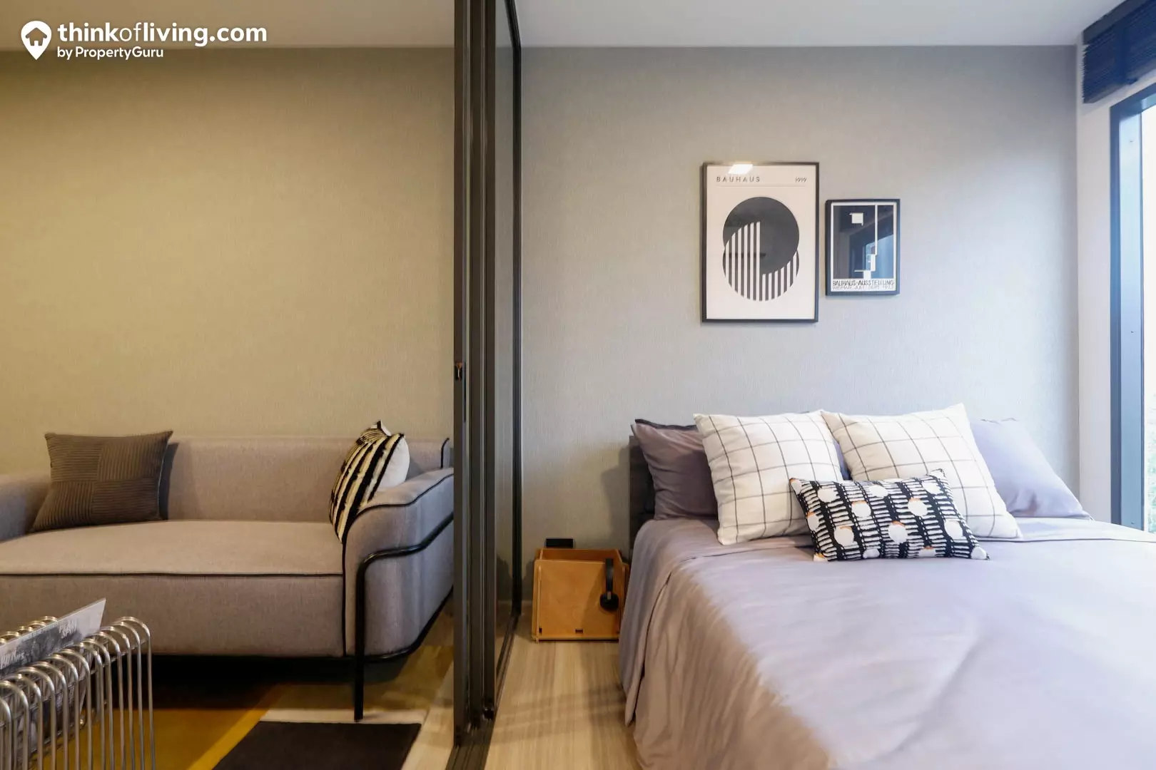 ส่วนภายในห้องหลักจะเป็นการรวมกันระหว่าง Living Area และห้องนอน (ลักษณะคล้ายกับห้อง Studio) เพื่อเชื่อมต่อกันให้กว้างขวางโปร่งโล่ง โดยลดทอนฟังก์ชันโต๊ะทานอาหารหรือโต๊ะอเนกประสงค์ออกไป ซึ่งอาจปรับมาใช้งานร่วมกับโซฟาในตัวไปเลยก็ได้ค่ะ