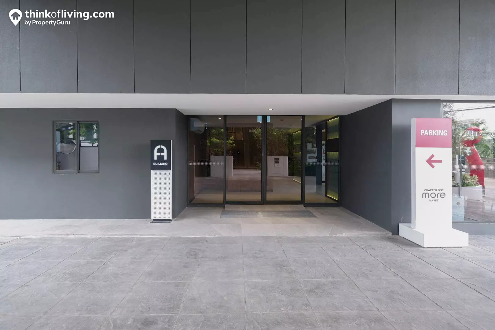 ภาพบรรยากาศบริเวณด้านหน้าโครงการ Chapter One More Kaset จะมีป้ายชื่อโครงการอยู่ด้านข้าง พร้อมจัดสวนอยู่ด้านหน้าโครงการ เป็นมุมต้อนรับที่สร้างบรรยากาศร่มรื่นตั้งแต่ด้านหน้าโครงการเลย