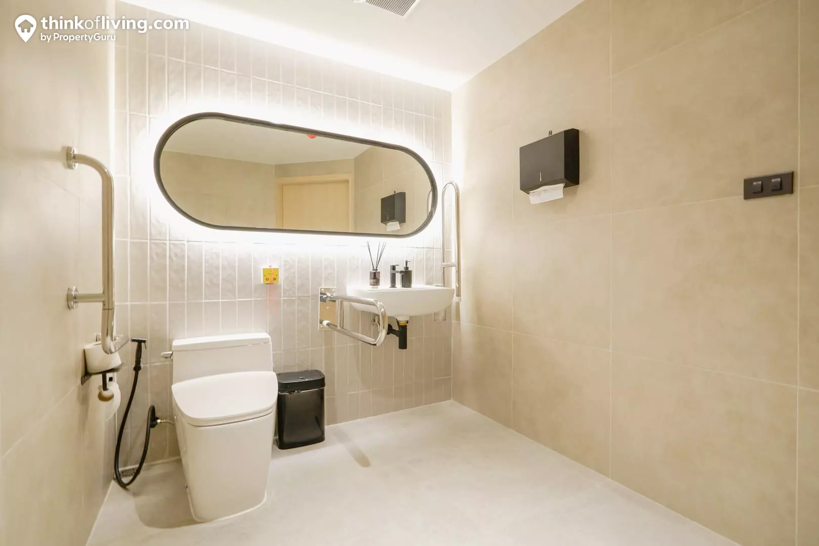ด้านซ้ายมือจะเป็นห้องน้ำที่ใช้งานร่วมกันภายในห้อง ซึ่งจะหลบมุมมองสายตาจากหน้าประตูห้อง ทำให้มีความเรียบร้อยและเป็นส่วนตัวในการใช้งานมากขึ้น