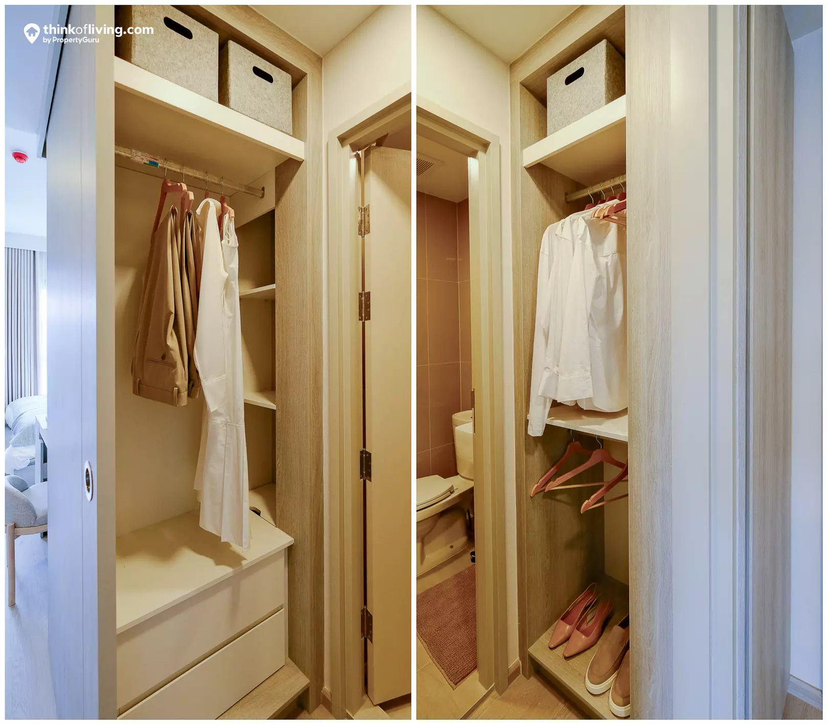 ตู้เสื้อผ้าเป็น Built – in เข้ามุมขนาดใหญ่สูงถึงฝ้า ติดกันเป็นประตูทางเข้าห้องน้ำ เมื่ออาบน้ำเสร็จก็เดินออกมาแต่งตัวได้เลย ในตู้มีราวแขวนผ้า ชั้นวางของ และลิ้นชักติดตั้งมาให้เรียบร้อย ใช้งานได้หลากหลาย