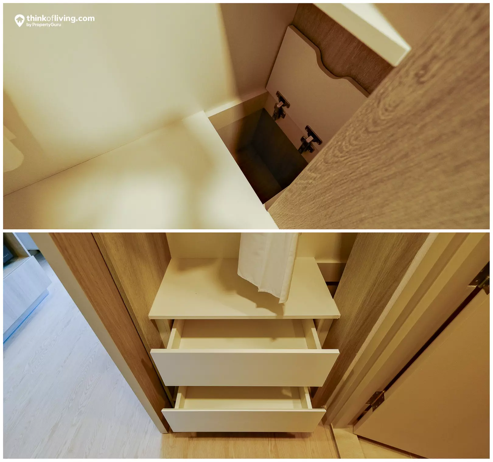 ตู้เก็บรองเท้าหน้าห้องจะแบ่งเป็นตู้ช่องโล่งสำหรับวางของที่ต้องหยิบใช้เป็นประจำอย่าง กุญแจรถ, Keycard, ร่ม