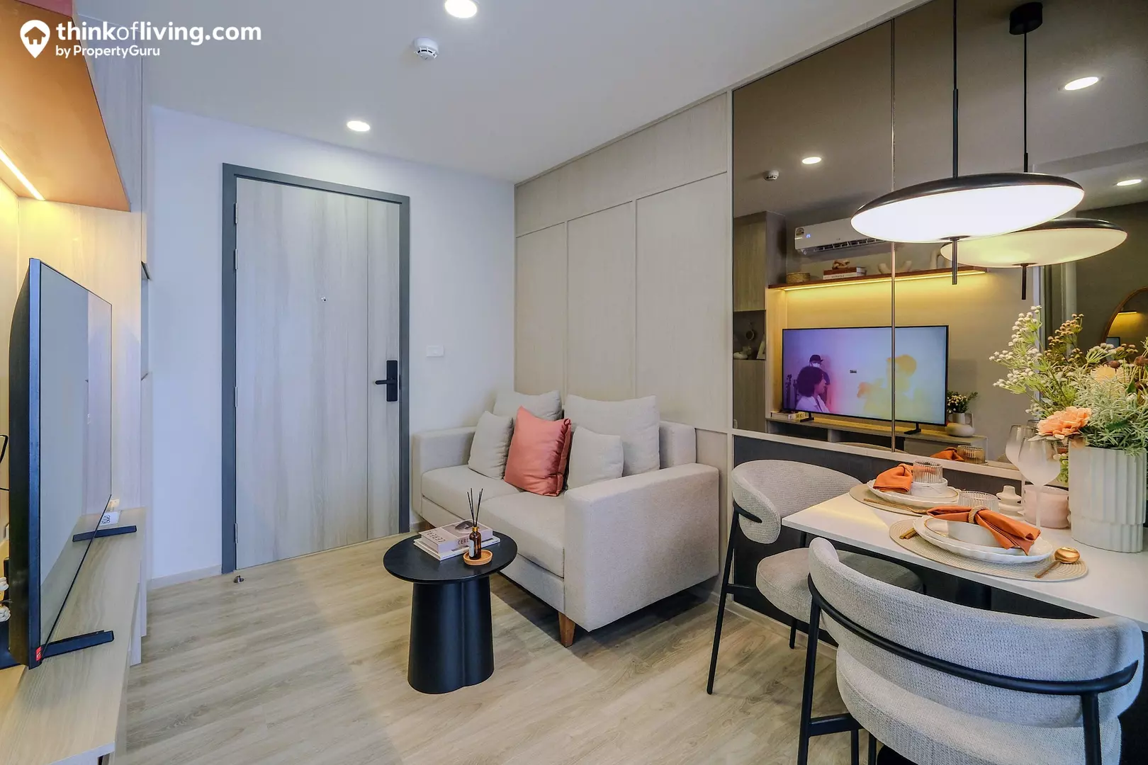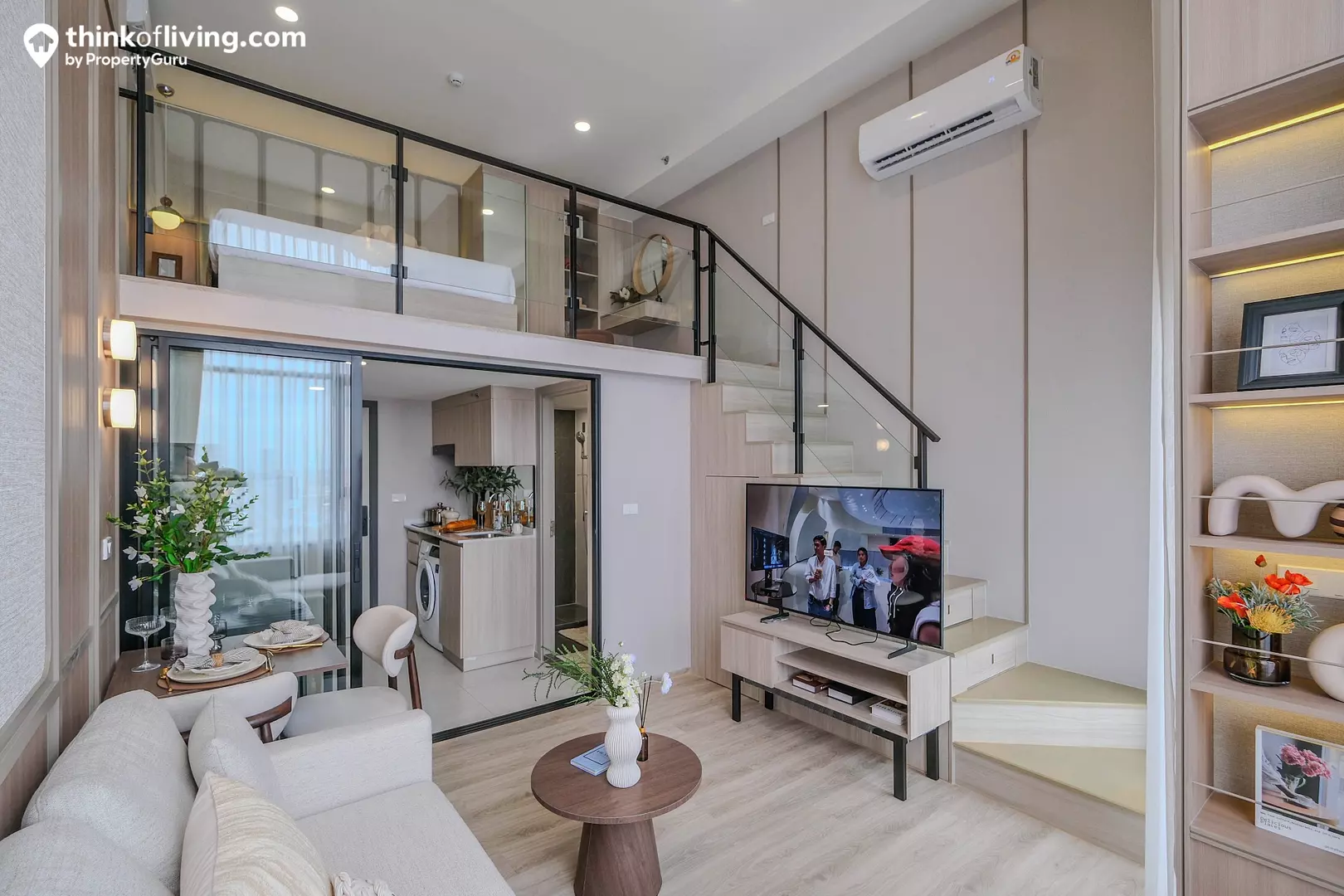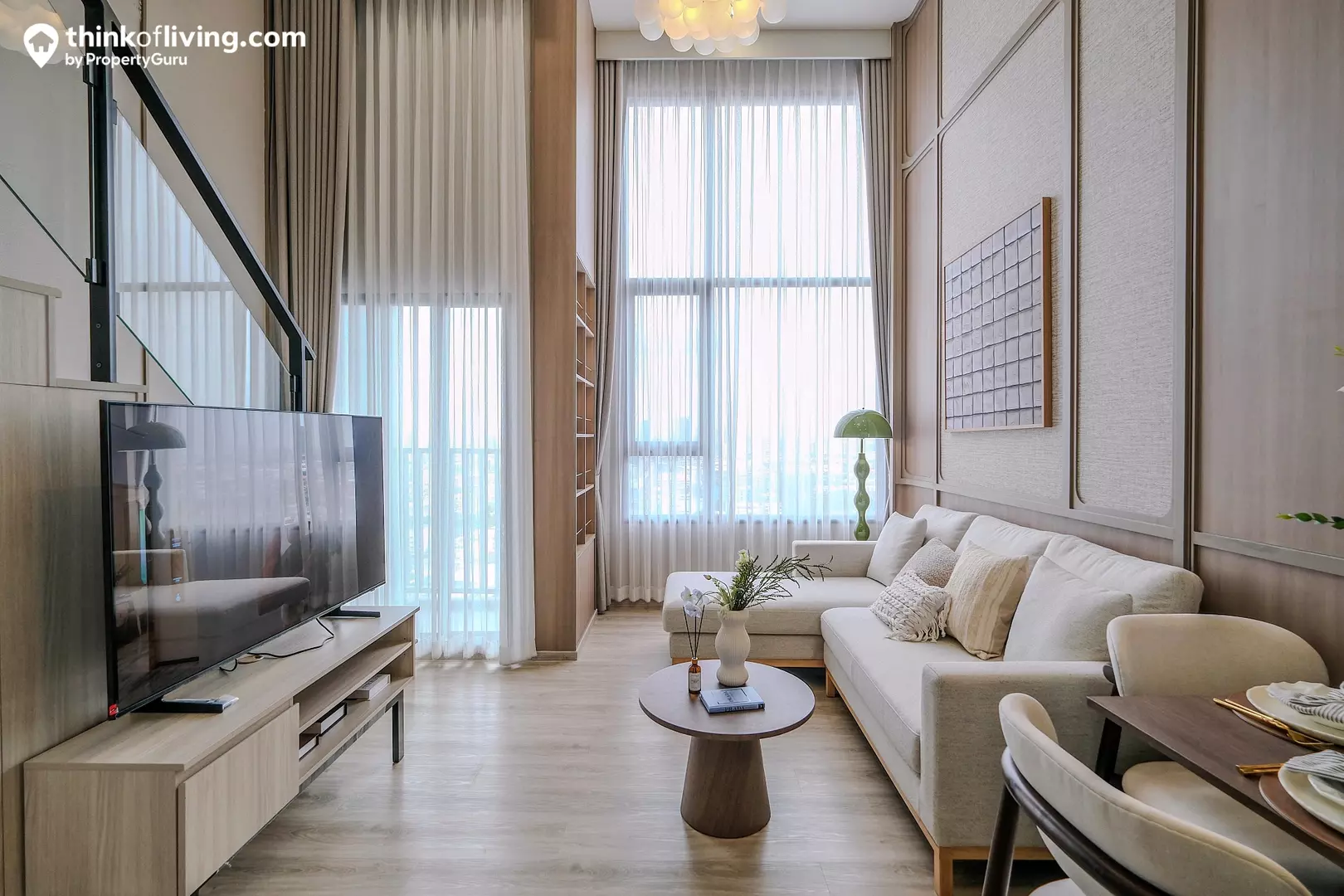ส่วนนั่งเล่นได้พื้นที่ค่อนข้างกว้าง ระยะห่างจากโซฟาถึงหน้าทีวีได้มาถึง 3 เมตร สามารถวางโซฟารูปตัว L เหมือนในห้องตัวอย่างได้เลย หรือใครจะเลือกโซฟาไซส์เล็กหน่อย แล้ววางโต๊ะทำงานด้านข้างเพิ่มก็ได้ ส่วนอีกฝั่งวางเป็นโต๊ะทานข้าว 2 ที่นั่งได้กำลังดี ส่วนชั้นวางทีวีได้เป็นตู้ลอยจากโครงการ บันไดขึ้นชั้นลอยยังมีตู้เก็บของมาให้อีกจุดด้วย