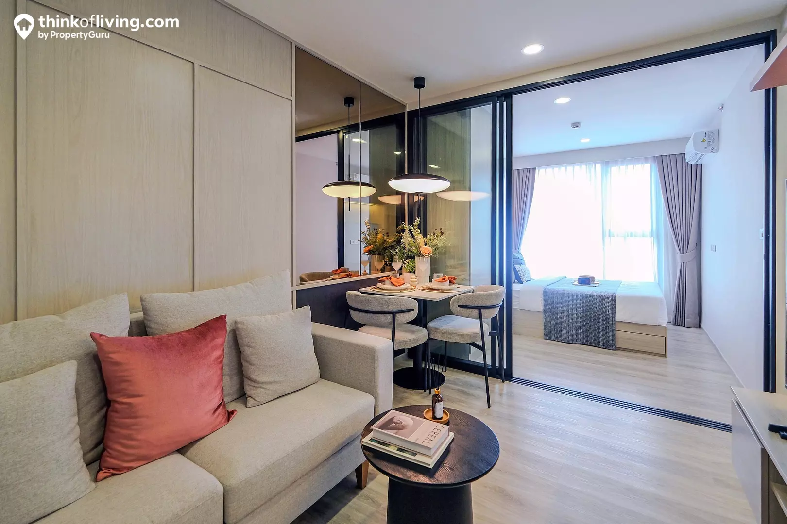 1 Bedroom 22 ตร.ม. เป็นห้องขนาดเริ่มต้น ราคา 2.39 ล้านบาท* ฟังก์ชันเหมาะกับคนที่เน้นความโปร่งโล่ง ไม่ต้องกั้นห้องเยอะ อยู่คนเดียวได้สบายๆ ด้านหน้าได้เป็นครัวปิดติดกับห้องน้ำ มีประตูบานเลื่อนกระจกกั้นแยกออกจากส่วนพักผ่อนด้านใน ช่วยเพิ่มความเป็นส่วนตัว โดยด้านในจัดเป็นมุมนั่งเล่น ห้องนอน และ Bay Window วางโซฟาไว้นั่งพักผ่อนเพิ่ม หรือจะทำเป็นมุมนั่งทำงาน , วางโต๊ะเครื่องแป้งก็ได้ เดินเชื่อมต่อใช้งานง่าย