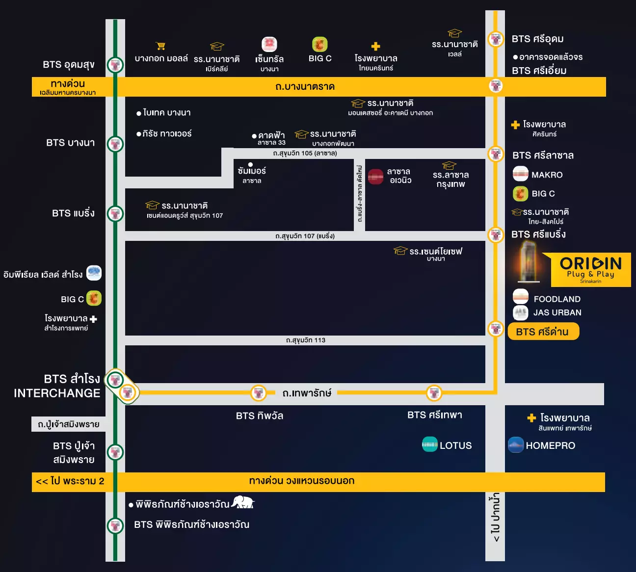 แผนที่กราฟฟิกจากโครงการ แสดงตำแหน่งของ Origin Plug & Play Srinakarin (ออริจิ้น ปลั๊ก แอนด์ เพลย์ ศรีนครินทร์) คอนโด High Rise ที่ตั้งอยู่ติดถนนศรีนครินทร์ โดยถนนเส้นนี้ถือเป็นถนนหลักที่ขับไปเชื่อมต่อกับถนนใหญ่ได้อีกหลายสาย ทั้งถนนบางนา – ตราด , ถนนเทพารักษ์ และถนนสุขุมวิท โดยใช้ซอยสุขุมวิท 105 (ลาซาล) , ซอยสุขุมวิท 107 (แบริ่ง) และซอยสุขุมวิท 113 (ด่านสำโรง) เป็นเส้นทางลัดได้ เหมาะกับคนที่ทำงานอยู่ในโซนบางนา – สุขุมวิท เดินทางเข้า – ออกเมืองง่าย ใกล้ทางด่วนถึง 2 สาย ทั้งทางด่วนวงแหวนรอบนอกและทางด่วนเฉลิมมหานครในระยะ 3.7 กิโลเมตร สำหรับใครที่ใช้รถส่วนตัวในการเดินทางก็ถือว่าสะดวกสบายมาก