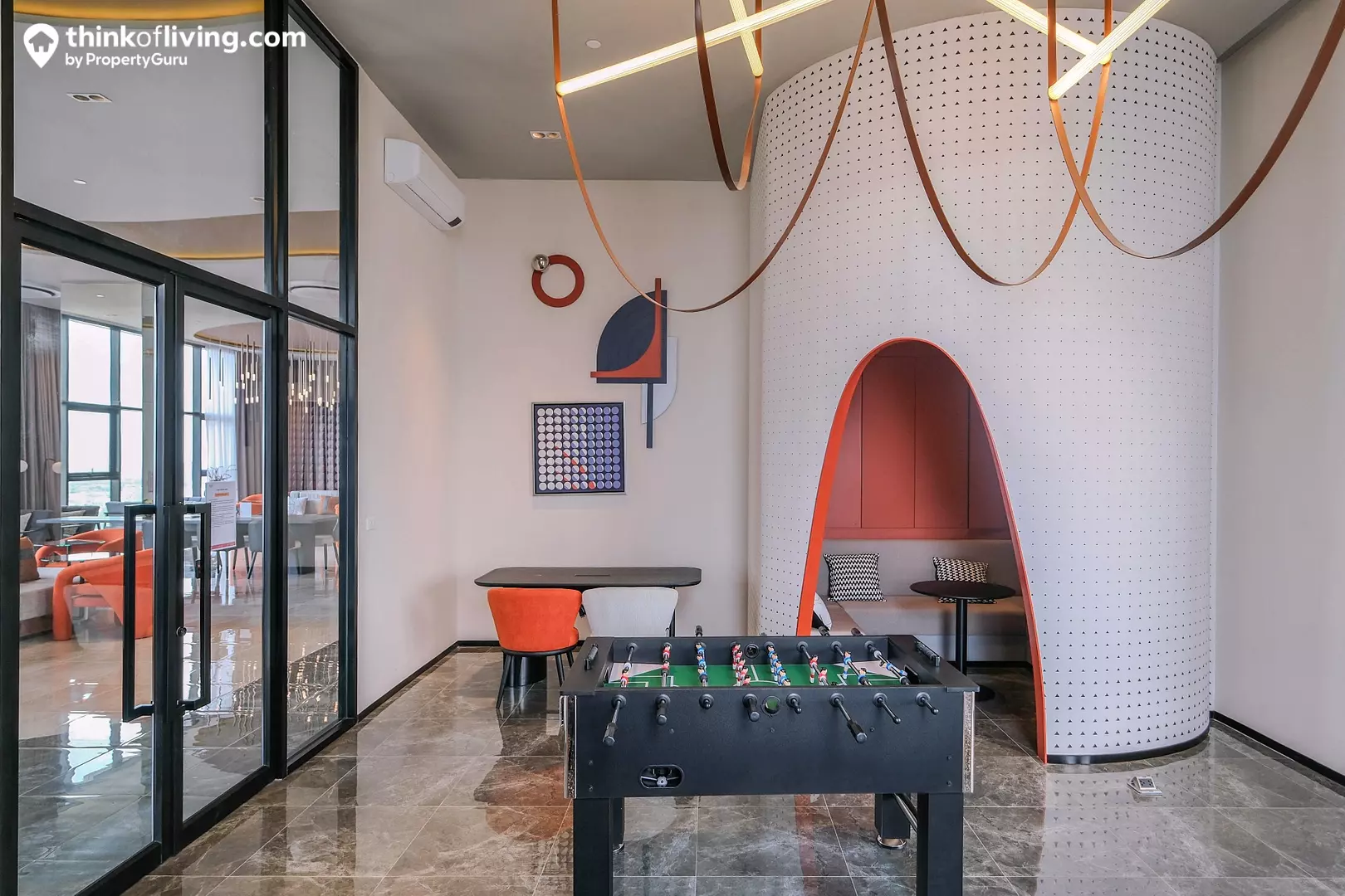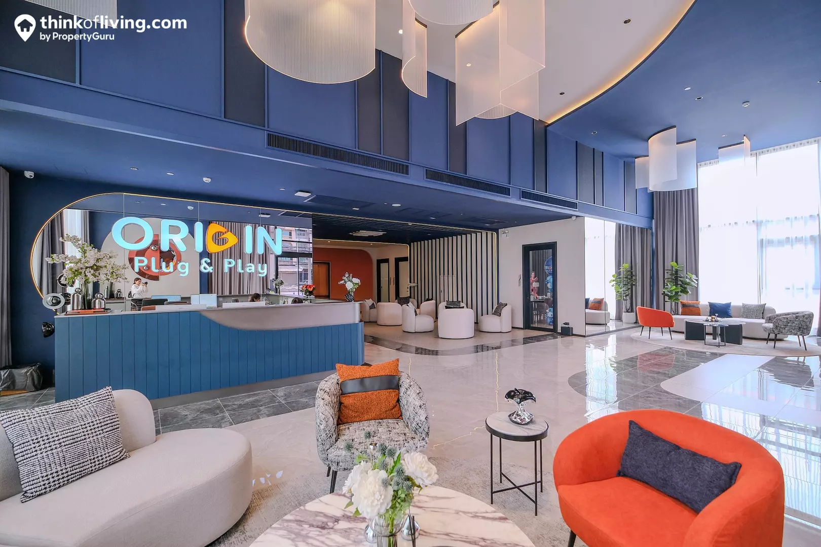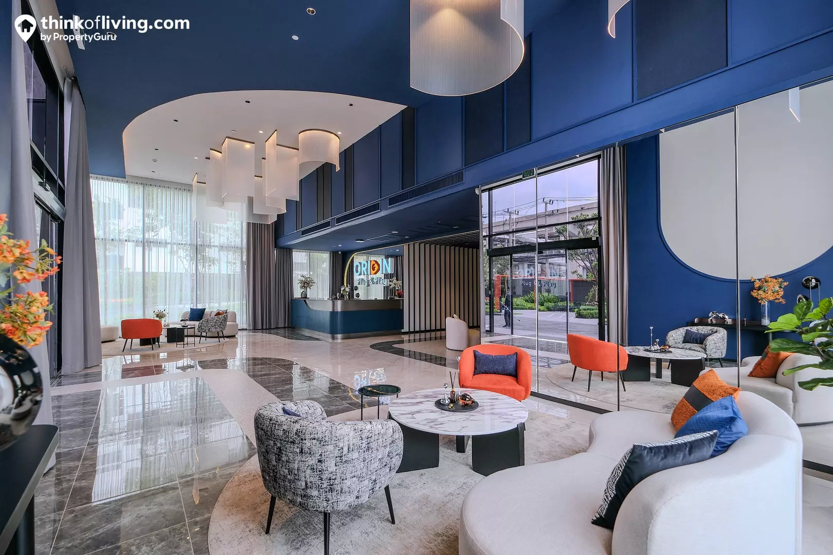 ภายในอาคารเป็น Grand Lobby ขนาดใหญ่ ได้ฝ้าเพดานสูงช่วยเพิ่มความโอ่อ่า โปร่งโล่ง การตกแต่งใช้โทนสีน้ำเงินตัดกับเฟอร์นิเจอร์สีส้มดูโดดเด่น ซึ่งโครงการจัดชุดโซฟามาให้หลายจุด ใช้เป็นพื้นที่นั่งพักคอย หรือรับรองแขกได้ จากด้านข้างมองออกไปยังเห็นวิวสวนสีเขียวด้านหน้าได้ด้วย