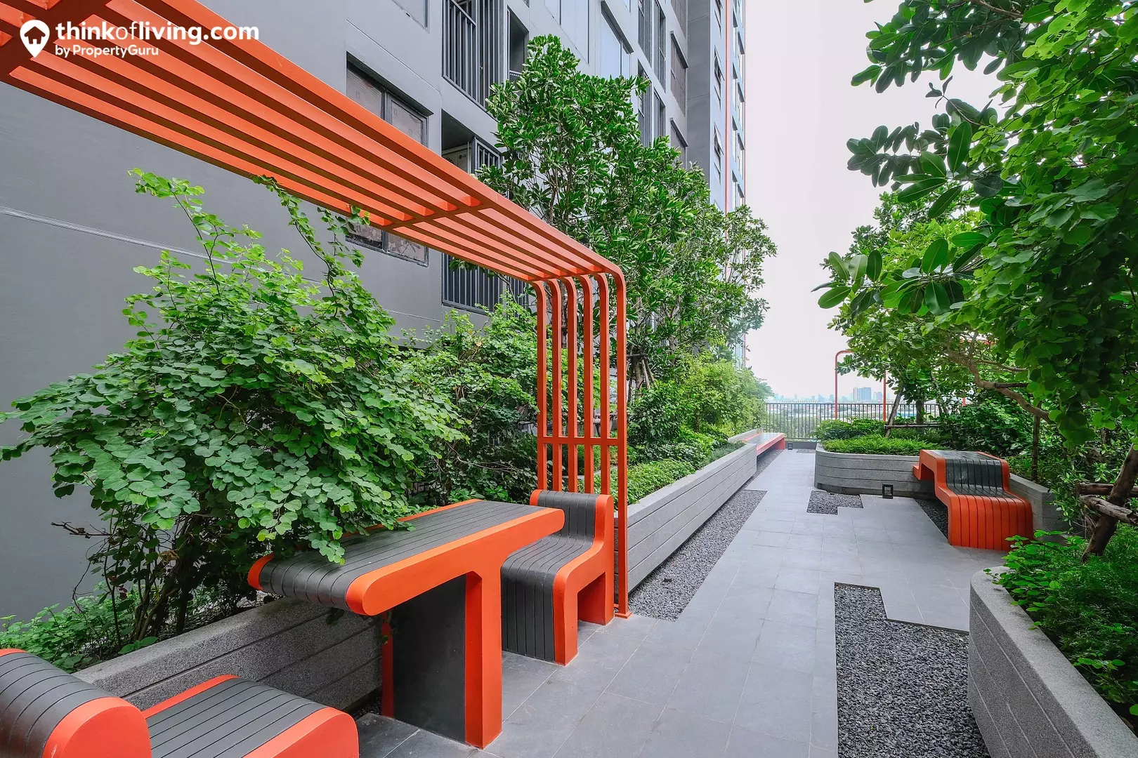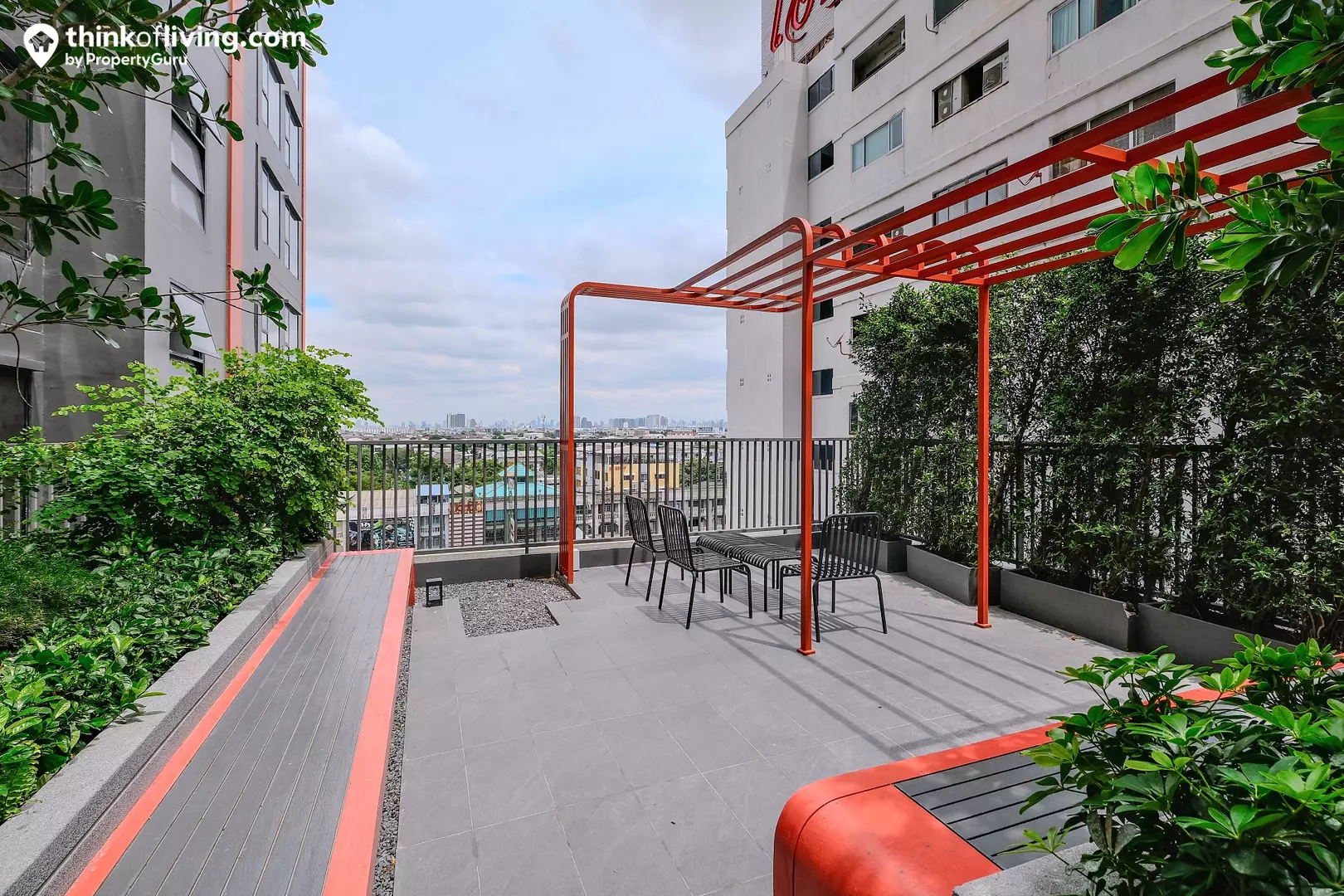 บรรยากาศสวนด้านนอกอาคารบริเวณชั้น 9 นอกจากจะมีต้นไม้ที่ตกแต่งมาช่วยเพิ่มความร่มรื่นแล้ว ยังมีที่นั่งให้ออกมานั่งเล่นพักผ่อนได้ด้วย
