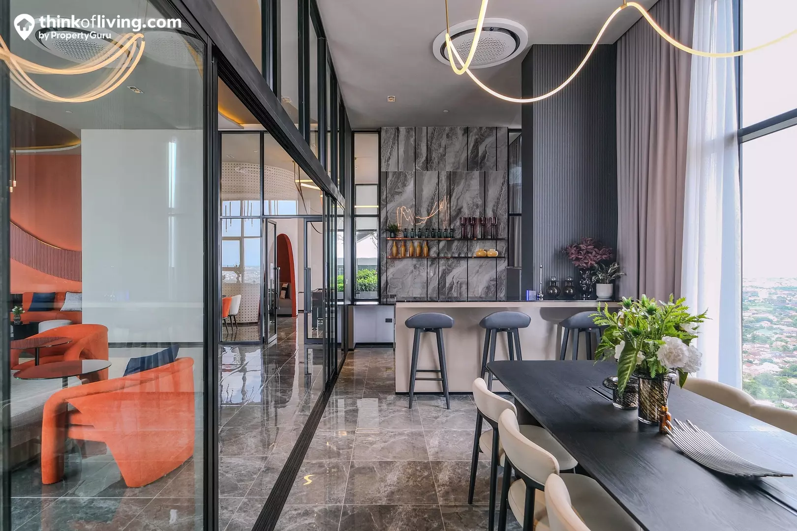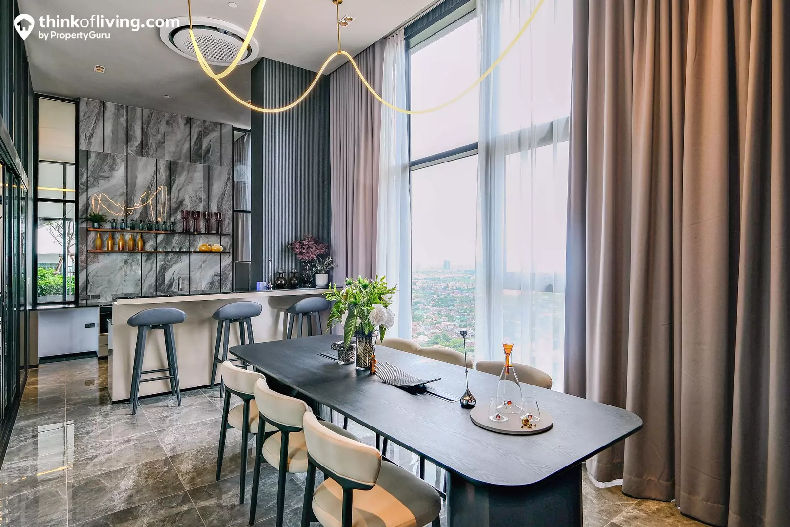 บรรยากาศในห้องดูโปร่งโล่งมากด้วยฝ้าเพดานสูง 4.2 เมตร ด้านข้างได้หน้าต่างกระจกเต็มบาน เปิดรับแสงและวิวได้แบบเต็มที่ ซึ่งห้องเพดานสูงนี้จะมีให้เลือกตั้งแต่ชั้น 17 ขึ้นไป ทำให้ได้วิวเมืองมุมสูงแบบเต็มตาเลย