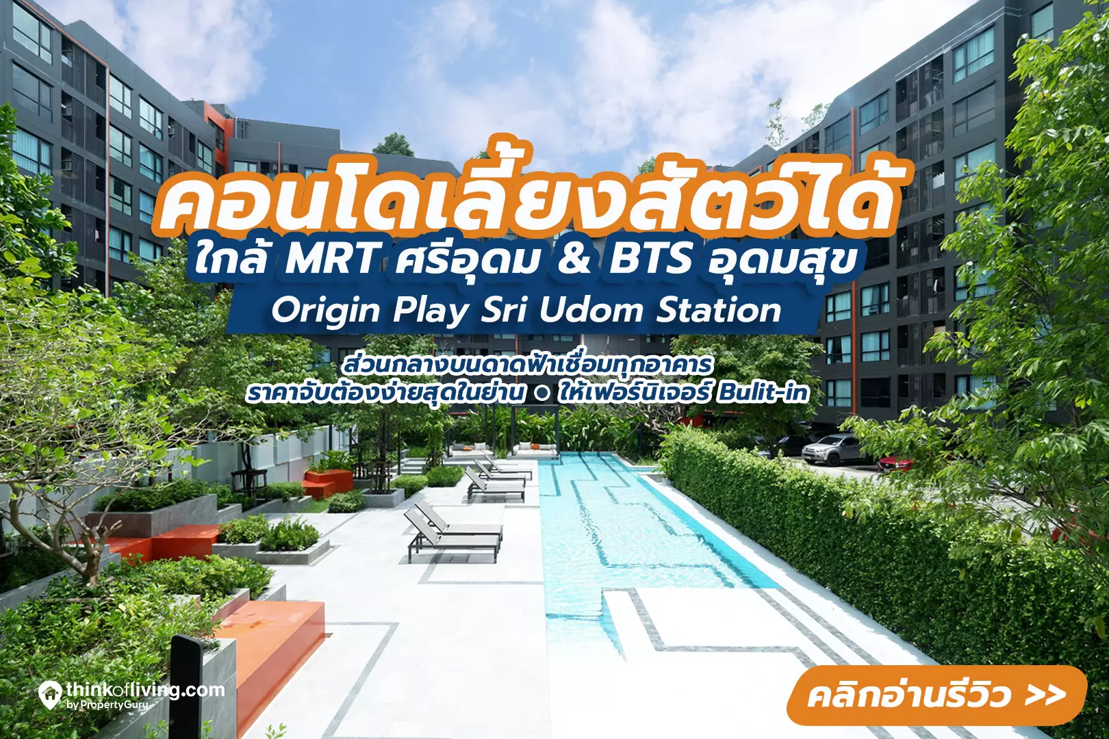 รีวิวฉบับที่ 2898 เมื่อ 3 ปีก่อนเราเคยพาทุกคนมาชม Sale Gallery และห้องตัวอย่างของ Origin Play Sri Udom Station (ออริจิ้น เพลย์ ศรีอุดม สเตชั่น) คอนโด Low Rise 8 ชั้น เลี้ยงสัตว์ได้แห่งแรกในย่านอุดมสุข แถมทำเล ไม่ไกลจากรถไฟฟ้าสาย 2 สายด้วยนะ ปัจจุบันคอนโดสร้างเสร็จพร้อมให้ย้ายเข้าอยู่กันแล้วนะ จะมีอะไรน่าสนใจบ้าง เราได้ Highlights ไว้ให้หมดแล้วค่ะ