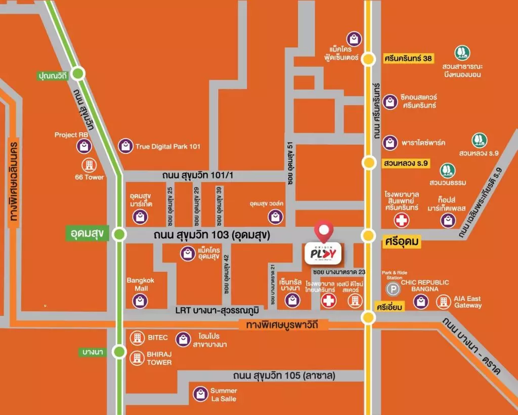 ทำเล : โครงการ  Origin Play Sri Udom Station (ออริจิ้น เพลย์ ศรีอุดม สเตชั่น) ตั้งอยู่ติดถนนอุดมสุขหรือสุขุมวิท 103 เชื่อมต่อไปยังถนนหลักได้ 3 เส้นทางคือถนนสุขุมวิท , ถนนศรีนครินทร์และถนนบางนา-ตราด รอบๆโครงการมีร้านค้าร้านอาหารอยู่เต็มไปหมด หาของกินได้ไม่ยากเลย แล้วยังใกล้กับแหล่งอุดมความสมบูรณ์ ไม่ว่าจะเป็นห้างสรรพสินค้า อย่าง Central บางนา , Little Walk , Seacon Square ศรีนครินทร์ ,  Paradise Park ศรีนครินทร์และโรงพยาบาลของทั้งคนและน้องหมาน้องแมวอย่าง โรงพยาบาลสินแพทย์ ศรีนครินทร์ ,โรงพยาบาลสัตว์ ทองหล่อ ศรีนครินทร์