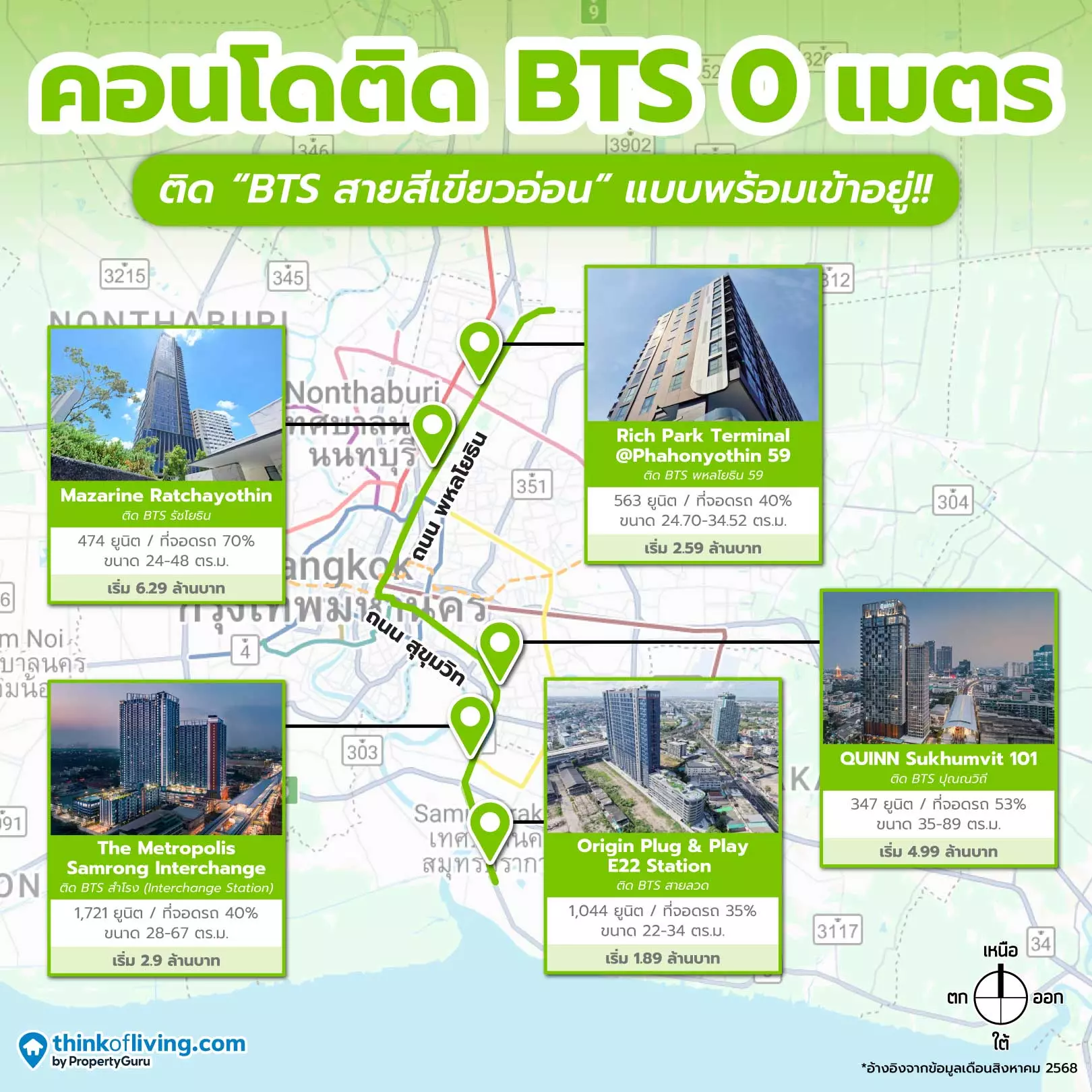 ครั้งนี้เราจะโฟกัสไปที่ “คอนโดพร้อมอยู่ ติด BTS สายสีเขียวอ่อน” เพราะมีเส้นทางยาวที่สุดและเชื่อมผ่านโซนสำคัญหลายโซน ไม่ว่าจะเป็นรัชโยธิน, ห้าแยกลาดพร้าว, สยาม, ทองหล่อ ไปจนถึงเอกมัย เรียกว่าครอบคลุมทุกไลฟ์สไตล์ตั้งแต่เรียน ทำงานหรือช้อปปิ้ง Hang Out จึงไม่แปลกที่คอนโดติดรถไฟฟ้าสายนี้ เป็นตัวเลือกอันดับต้นๆของทั้งที่คนซื้ออยู่เองและนักลงทุนที่ซื้อเพื่อปล่อยเช่าค่ะ