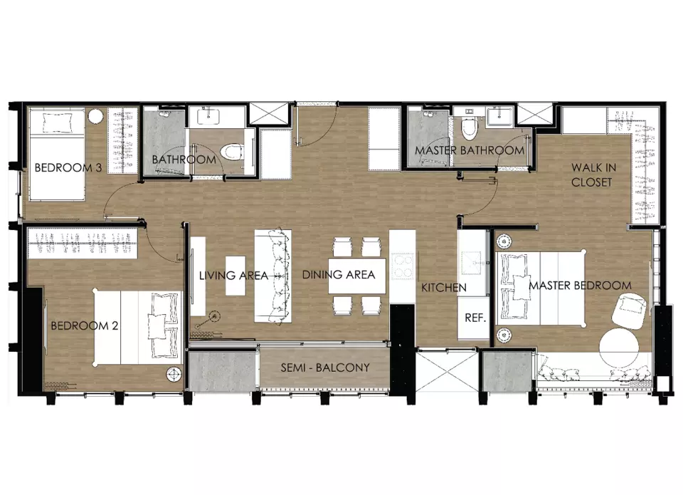 ครั้งนี้เราจึงขอพามาวิเคราะห์ 3 Bedroom 89 ตร.ม. ที่เป็น New Combined Unit โดยเป็นการนำห้อง 1 Bedroom Plus และ 2 Bedroom มาต่อกัน ทำให้ได้เป็นห้องหน้ากว้างพิเศษ รองรับกลุ่มครอบครัวโดยเฉพาะ โดยมีพื้นที่ตรงกลางห้องเป็น Common Area ขนาดใหญ่ มีพื้นที่นั่งเล่นและพื้นที่รับประทานอาหาร วางโต๊ะ 4ที่นั่งแล้ว ก็ยังมีพื้นที่เหลือเยอะ พร้อมระเบียงขนาดใหญ่อยู่ด้านข้างเป็นมุมอ่านหนังสือ ปลูกต้นไม้ได้ ส่วนพื้นที่ครัวจะอยู่ถัดจากพื้นที่นั่งรับประทานอาหาร ทำให้จัดเสิร์ฟ เตรียมอาหารได้ง่ายดี แต่ใครที่ไม่อยากให้กลิ่นควันอาหารลอยเข้าไปติดเฟอร์นิเจอร์ภายในห้องก็กั้นเป็นครัวปิดได้เลย มีช่องระบายกลิ่นและอากาศได้