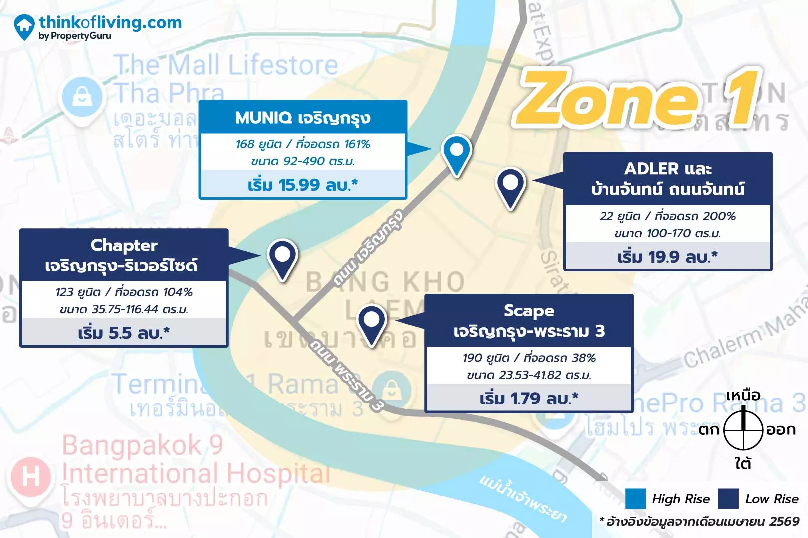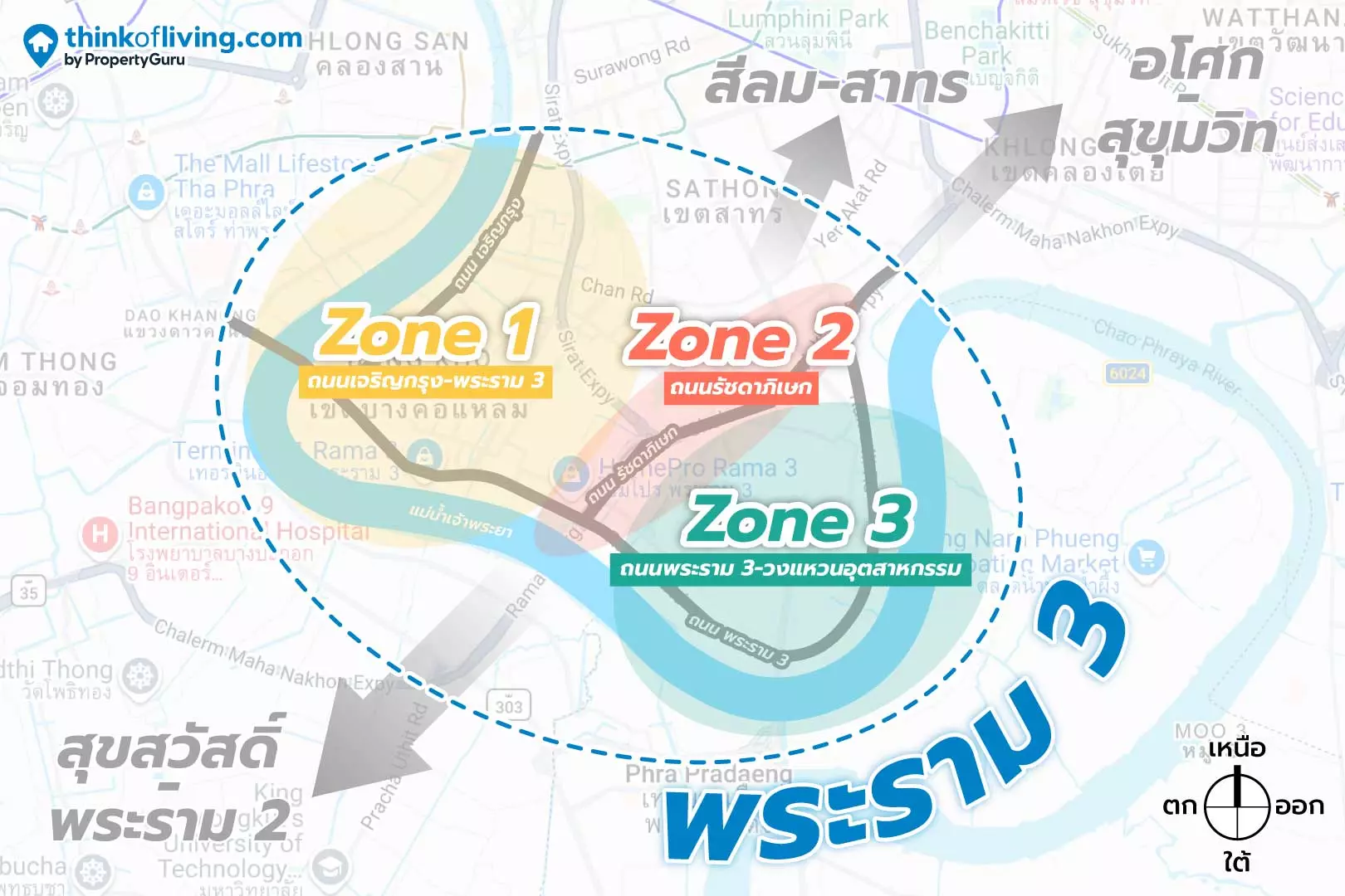 สำหรับบทความนี้ เราจะขอแบ่งคอนโดพระราม 3 ออกเป็น 3 โซนด้วยกัน ดังนี้