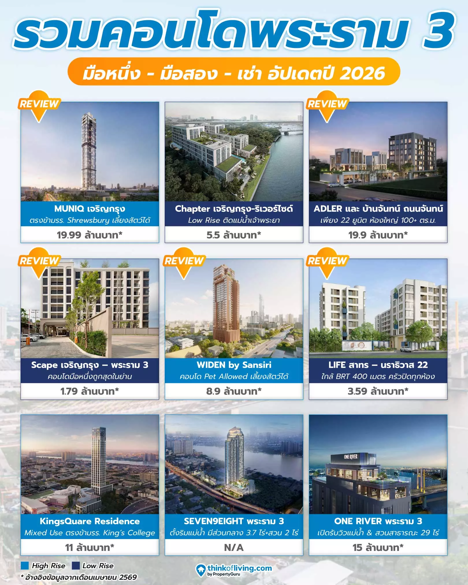 โดยบทความ “รวมคอนโดพระราม 3 มือหนึ่ง – มือสอง – เช่า อัปเดตปี 2026” จะมีทั้งคอนโด High Rise และ Low Rise บนย่านพระราม 3 ราคาเริ่มต้น 1.79-19.9 ล้านบาท*