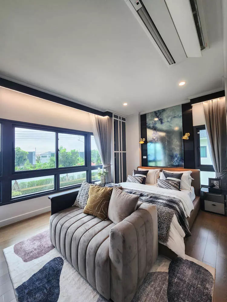 ห้อง Master Bedroom ของบ้านแบบนี้มีโซนที่ทำเป็นเหมือนระเบียง แต่มันดีตรงที่มีบานเปิดปิด ทำเป็นมุมนั่งเล่นภายในตัวบ้านได้ มีมุมที่ทำเป็น Walk in closet ได้ อยู่หน้าห้องน้ำที่มีอ่างอาบน้ำให้มาด้วย