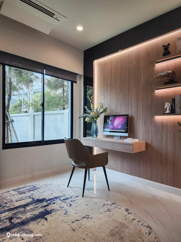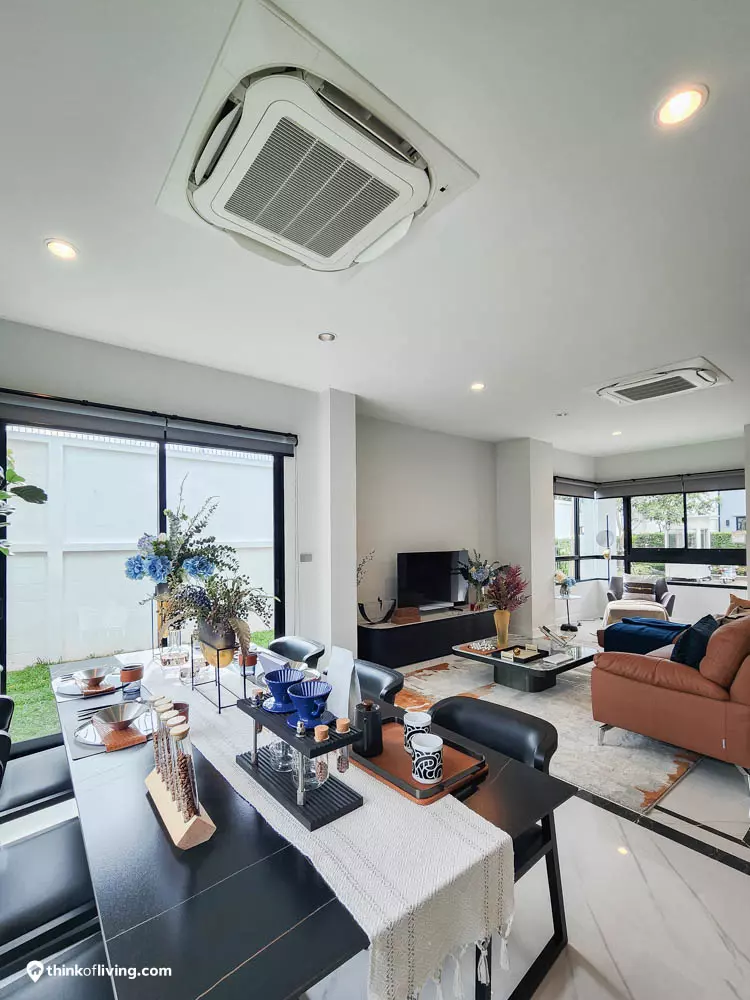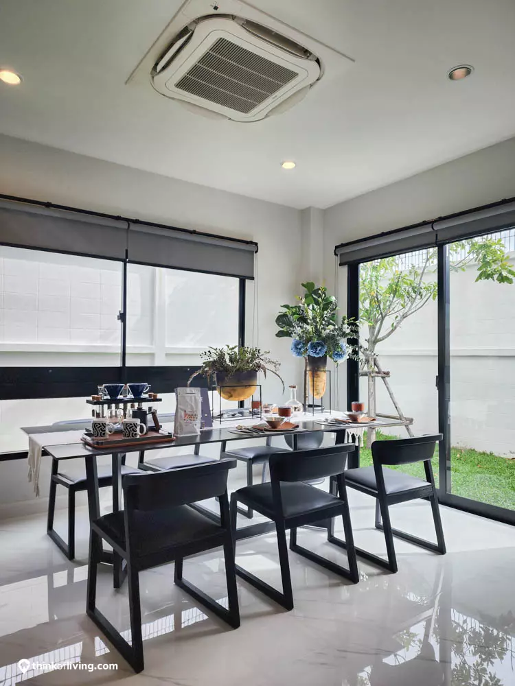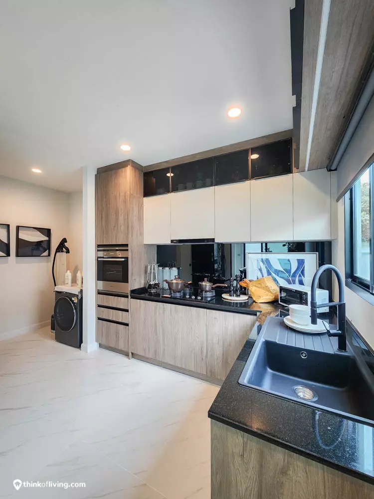 ชั้น 1 เป็นพื้นที่ Living และ Dining ชั้นนี้มีห้องนอนชั้นล่างด้วยนะ แต่น่าเสียดายไม่มีห้องน้ำในตัว แต่ก็ยังมีห้องน้ำให้ใช้งานใกล้ๆหน้าห้อง หรือถ้าไม่ทำเป็นห้องนอน ห้องนี้แอดมินทำเป็นห้องทำงานแน่ๆ และยังมีพื้นที่ครัวซึ่งให้มาใหญ่มากเป็นครัวปิด ทำกับข้าวได้แบบจัดเต็ม