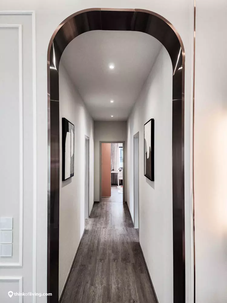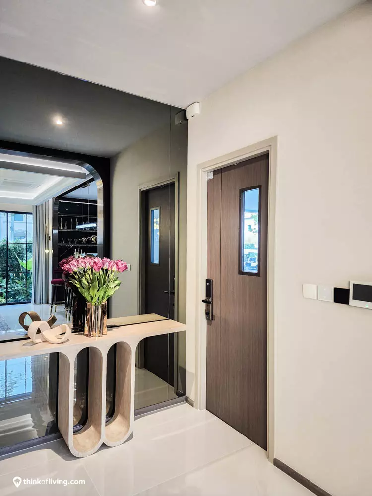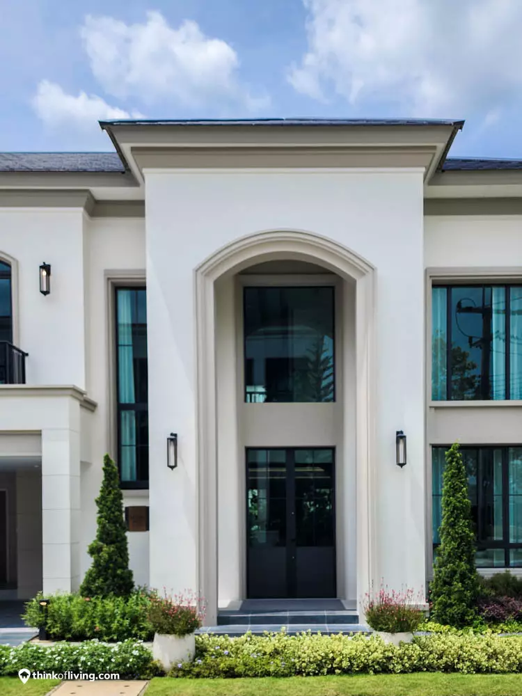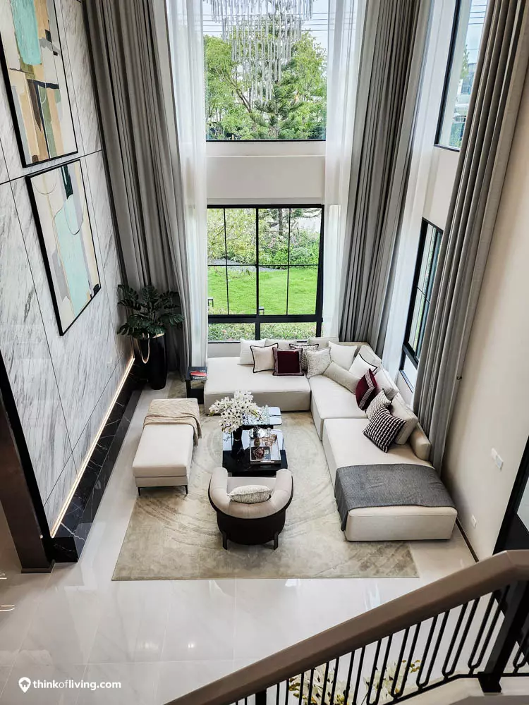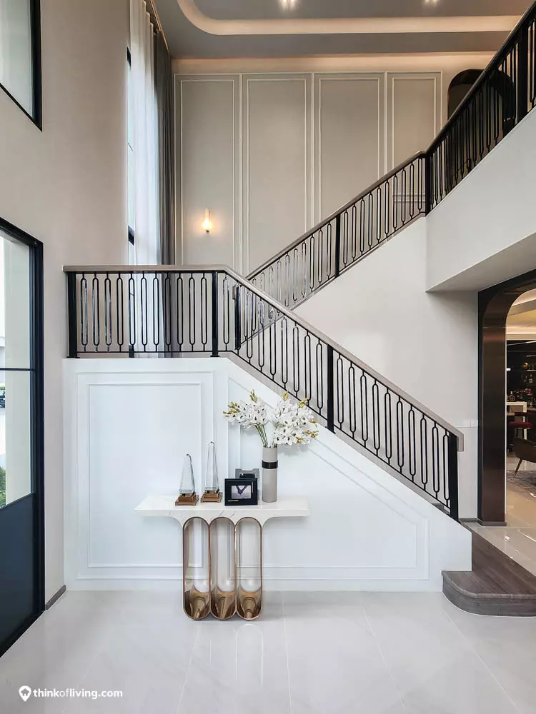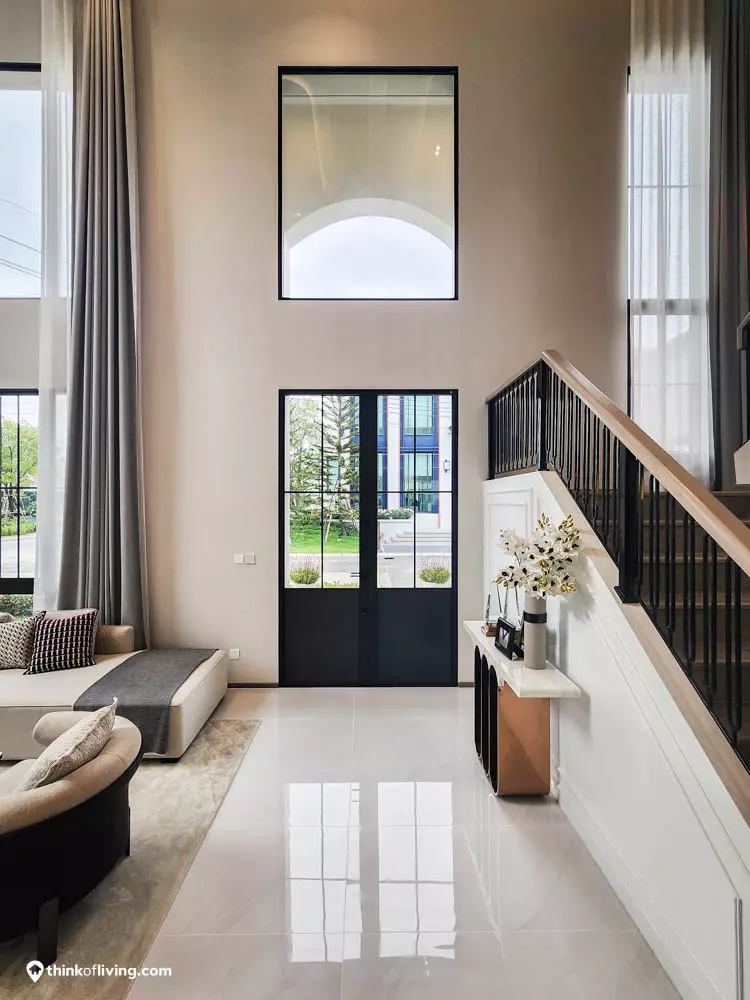 ซุ้มทางเข้าบ้านทำเป็นซุ้มโค้งขนาดใหญ่เพิ่มความหรูหราให้กับบ้าน เข้ามาในบ้านจะเจอกับพื้นที่ Double Volume ทำให้บ้านดูโปร่ง ข้างๆกันจะมีโซน Living ขนาดใหญ่ ตรงนี้สว่างมากๆครับช่องแสงบานใหญ่ นั่งชิลล์ๆ เพลินๆ ชมสวนข้างบ้านได้