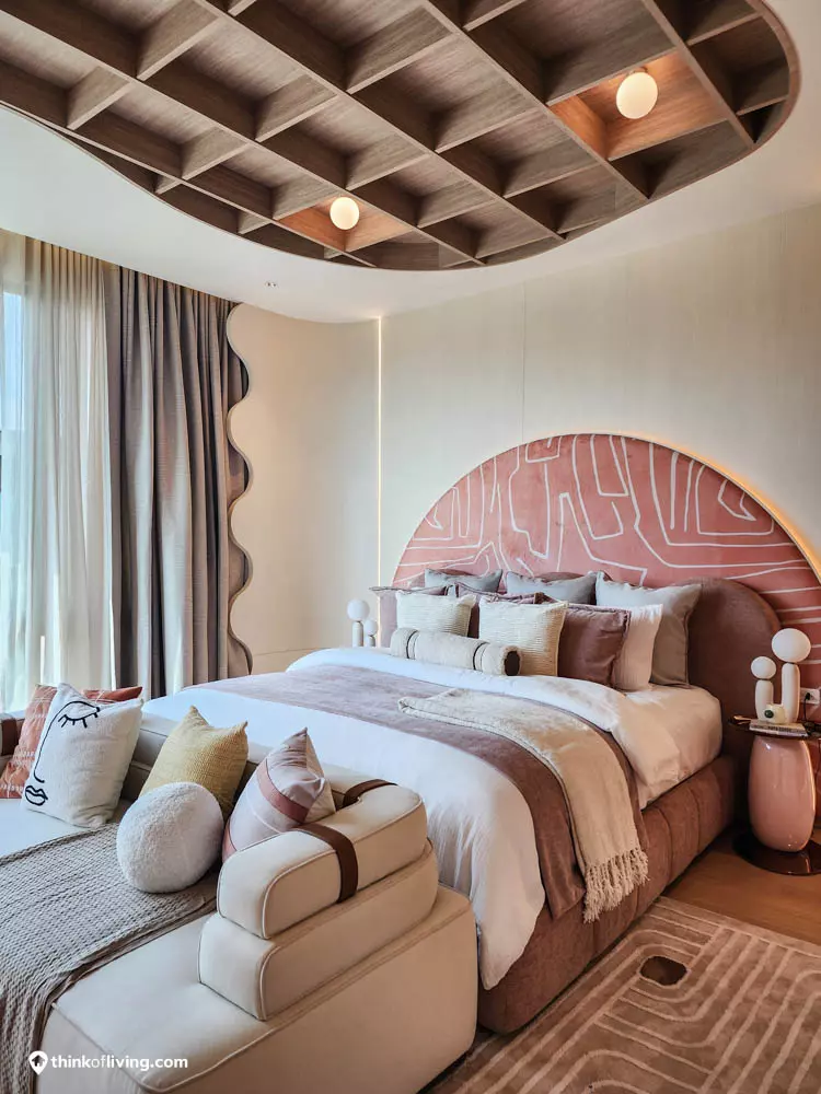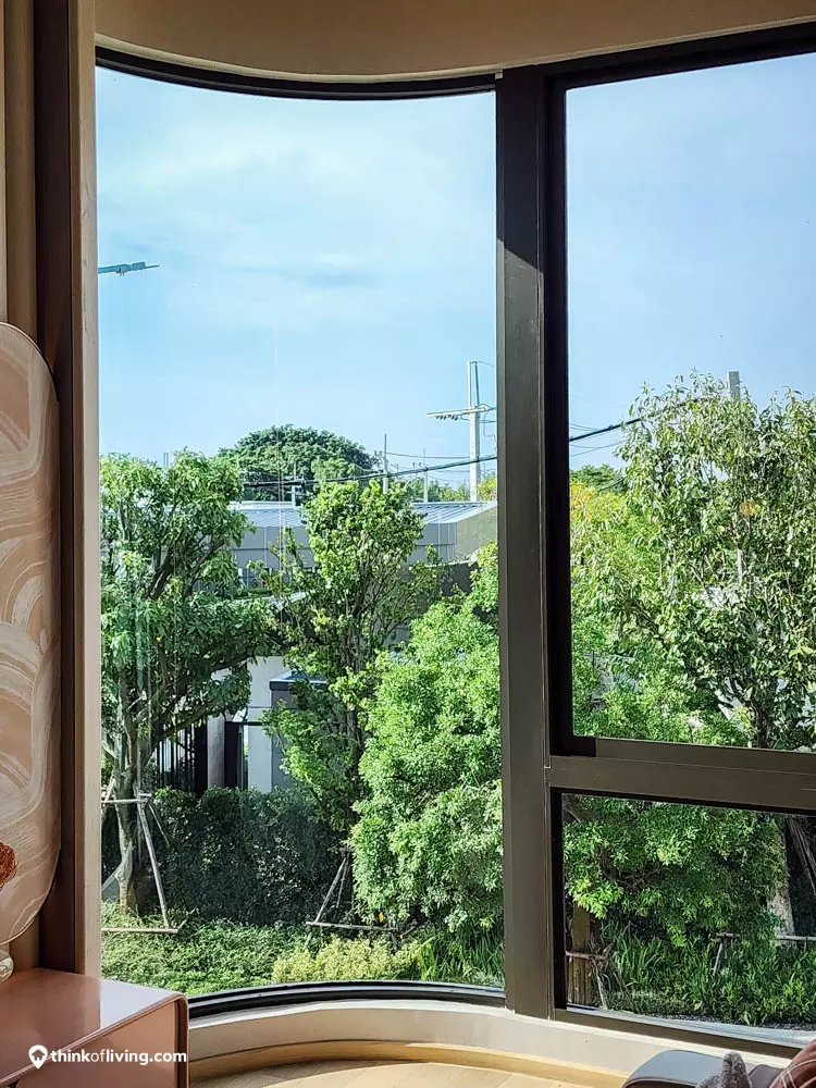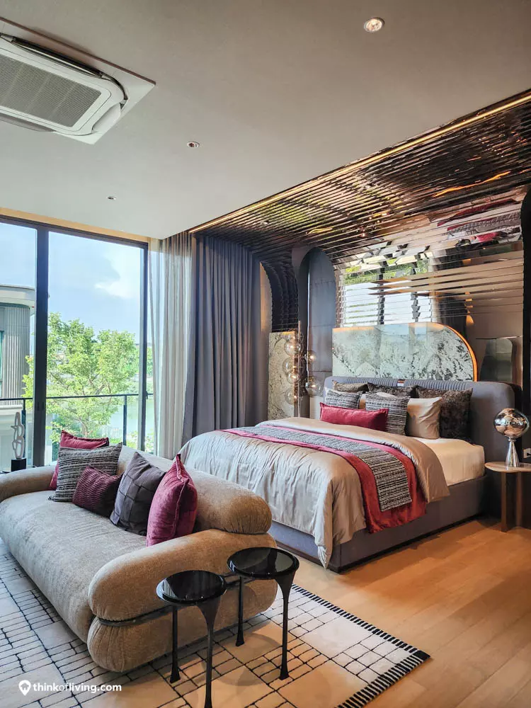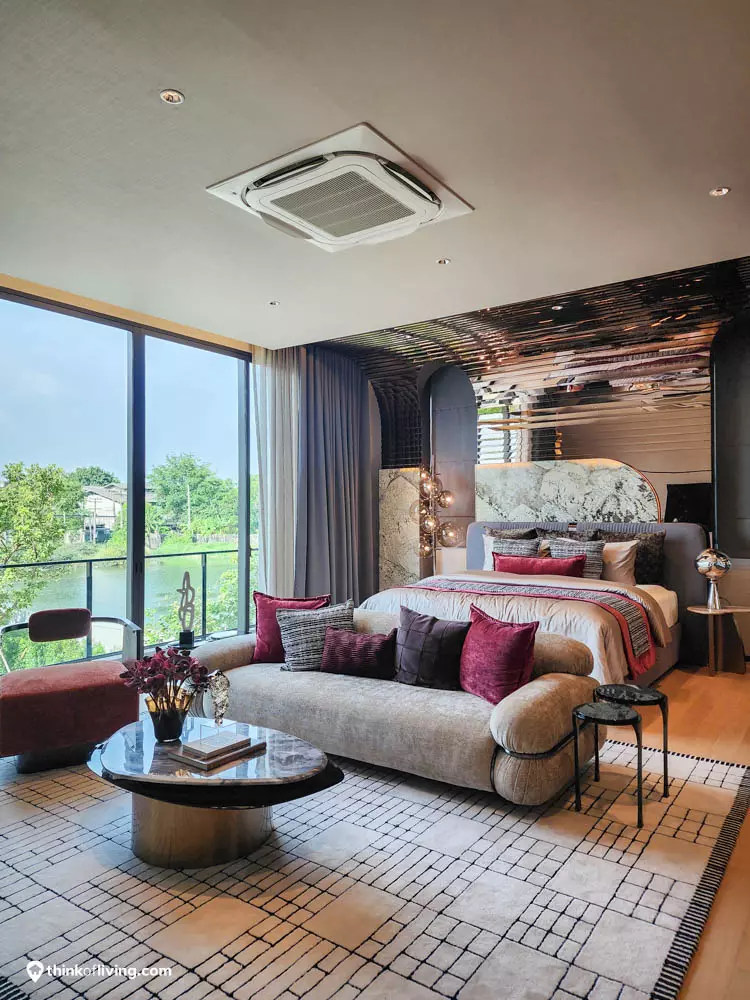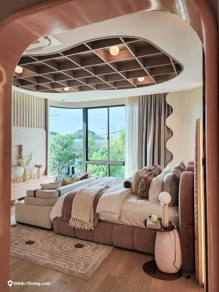 อีกมุมของบ้านขั้น 2 ขึ้นบันไดที่เล่นระดับมาหน่อยก็จะเจอห้องนอนรองอีกห้อง ใหญ่นะ จะเรียกว่ามี Master bedroom อีกห้องก็ว่าได้ มีกระจกตรงมุมห้องที่ทำมาทรงโค้ง ตรงนี้เท่ดีนะ และยังเปิดมุมมองสวยๆอีกด้วย ห้องนี้มี Walk in closet ด้วยนะ ที่สำคัญมีอ่างอาบน้ำในห้องน้ำด้วย