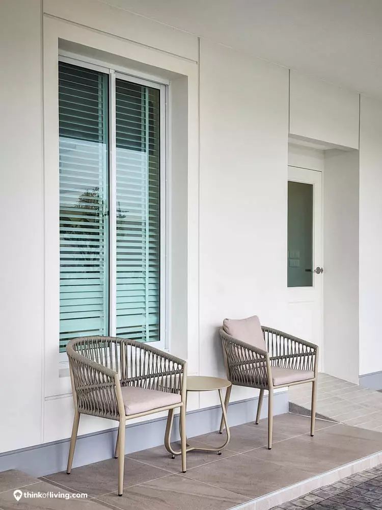 บ้านออกแบบมาเป็นบ้านหน้ากว้าง ผมชอบนะ ทำให้บ้านดูใหญ่ ได้ช่องแสงเยอะ ทำให้ภายในบ้านดูสว่าง และโปร่งโล่ง พื้นที่ชั้นล่างนี่ จัดวางเฟอร์นิเจอร์ได้แบบหลวมๆ ชั้นล่างมีห้องนอนให้ด้วยนะ พร้อมห้องน้ำในตัว