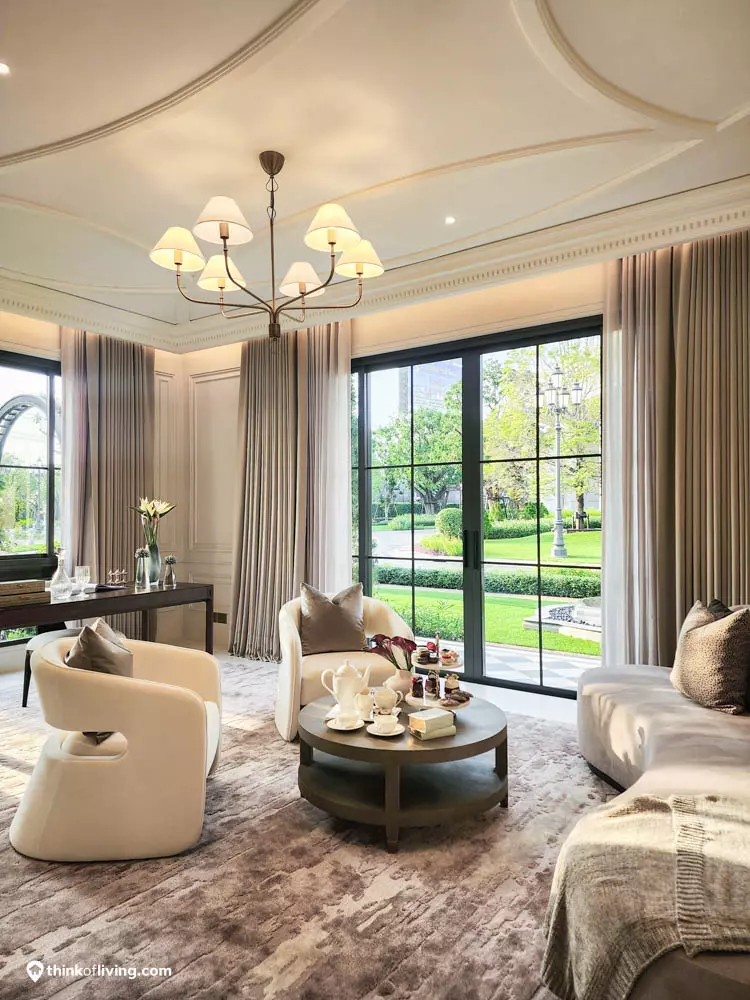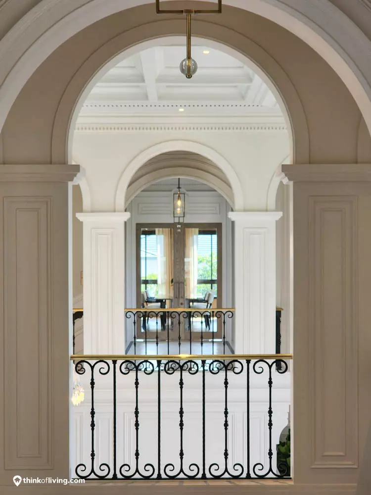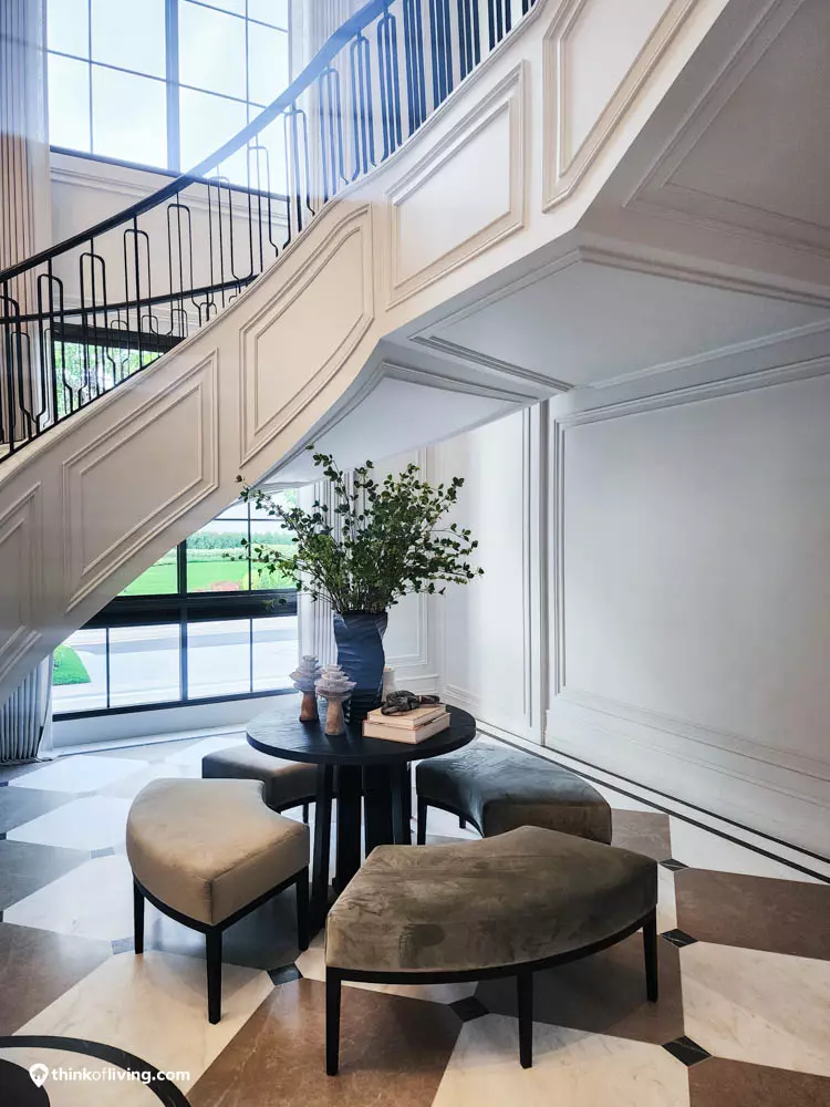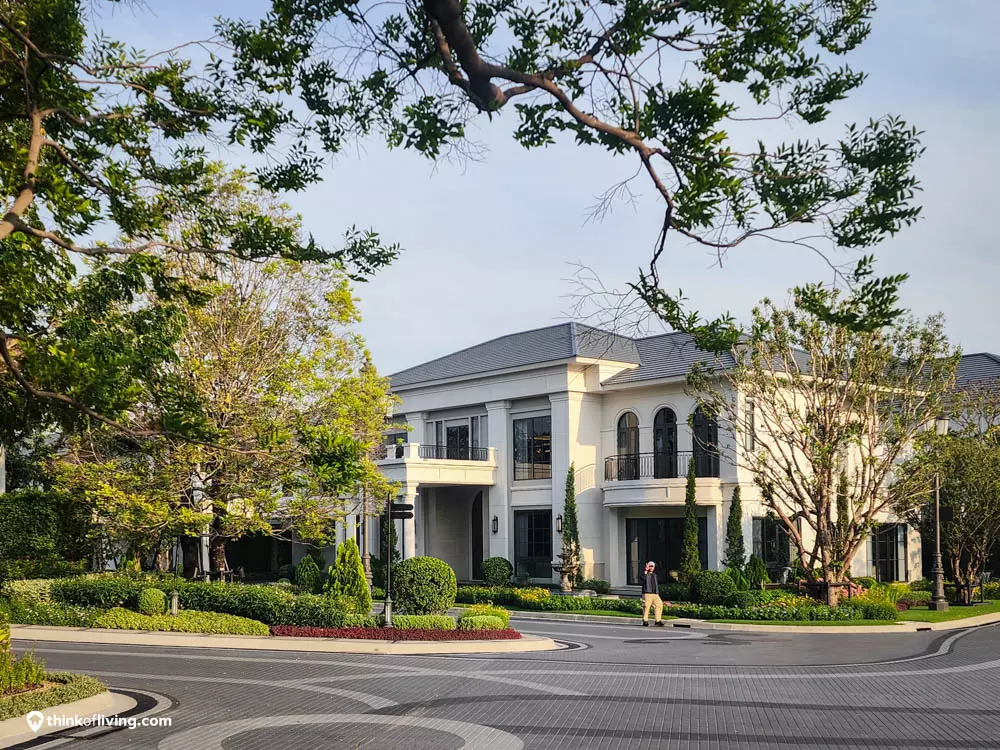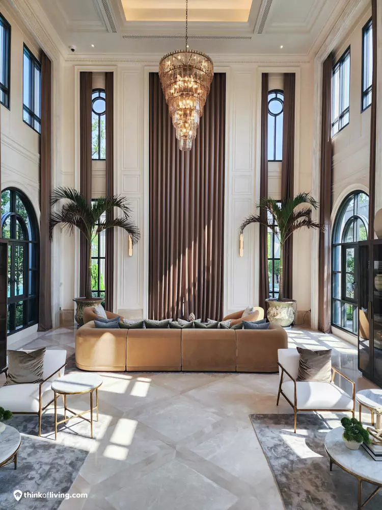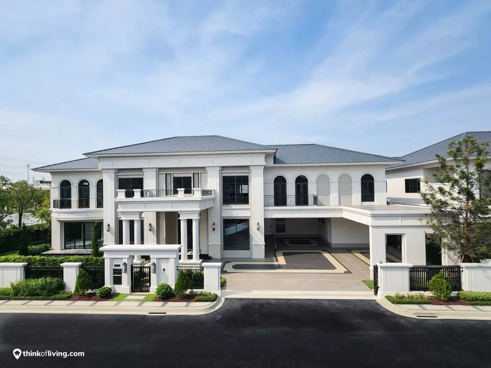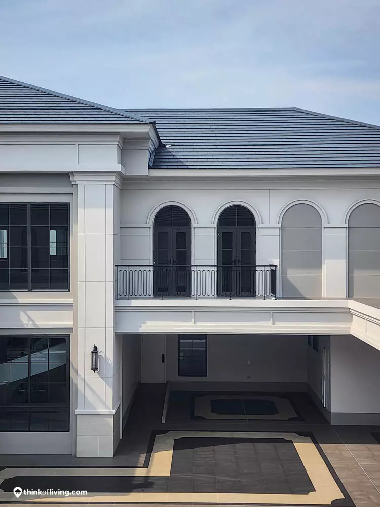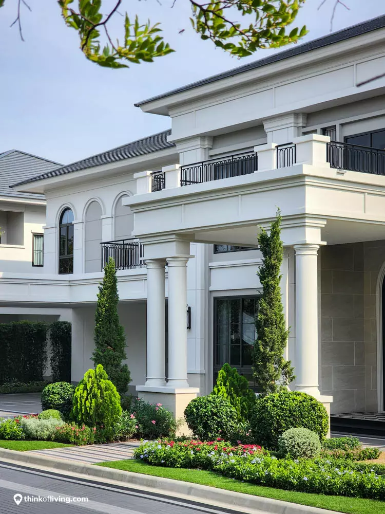 ตัวบ้านได้แรงบันดาลใจจากสไตล์ Regency ในช่วงต้นศตวรรษที่ 19 เน้นความหรูหรา คลาสสิกแบบพระราชวังบักกิงแฮม โดดเด่นด้วยความสมมาตร สัดส่วนขนาดใหญ่ และรายละเอียดอย่างซุ้มโค้ง ลูกฟัก เสากลม และบัวหัวเสา พร้อมสี Earth Tone นุ่มนวล ช่วยให้อาคารที่ดูหนักแน่น มีความละมุนนุ่มนวลยิ่งขึ้น