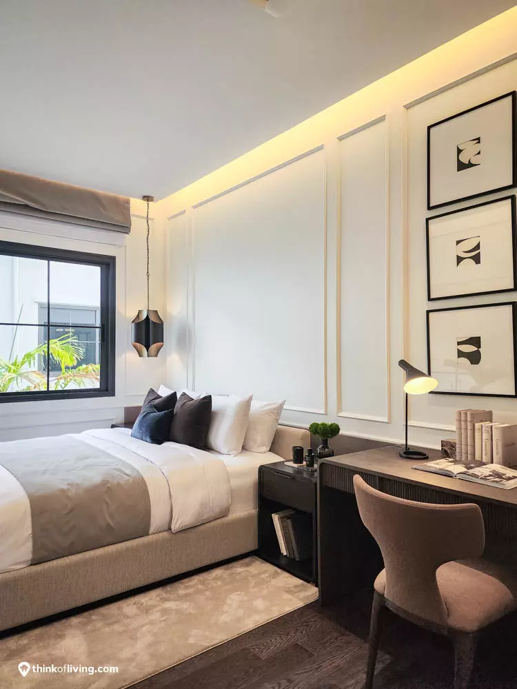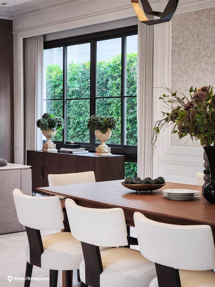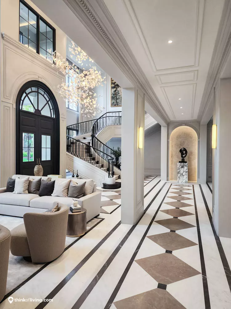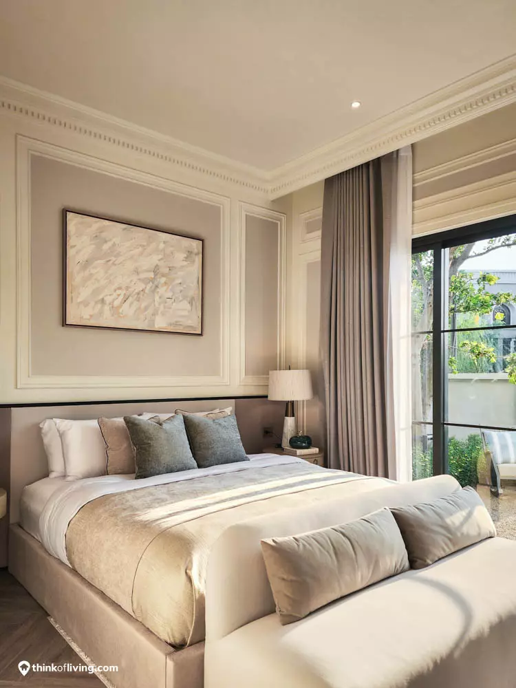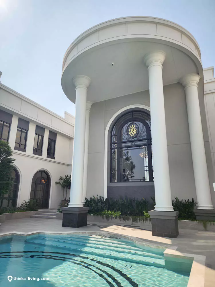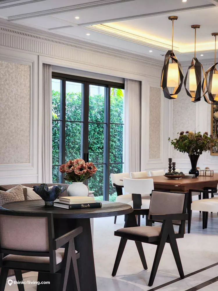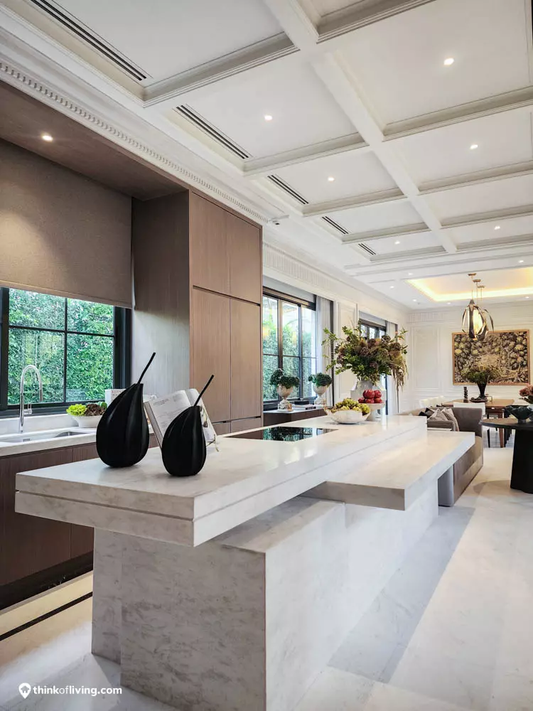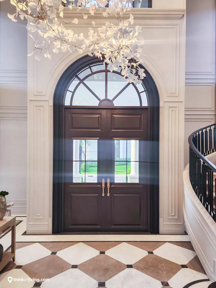 ตัวบ้านได้แรงบันดาลใจจากสไตล์ Regency ในช่วงต้นศตวรรษที่ 19 เน้นความหรูหรา คลาสสิกแบบพระราชวังบักกิงแฮม โดดเด่นด้วยความสมมาตร สัดส่วนขนาดใหญ่ และรายละเอียดอย่างซุ้มโค้ง ลูกฟัก เสากลม และบัวหัวเสา พร้อมสี Earth Tone นุ่มนวล ช่วยให้อาคารที่ดูหนักแน่น มีความละมุนนุ่มนวลยิ่งขึ้น